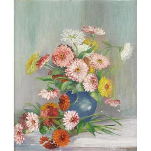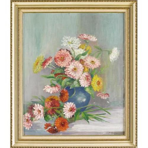 <B>NANNIE HUDDLE (1860-9151)</B></I><BR>Untitled Still Life Zinnias<BR>Oil on canvas<BR>22 x 26 inches (55.9 x 66.0 cm)<BR>Signed lower right<BR><BR> Nannie Zenobia Carver was born in Wistler, Alabama, and relocated to Austin, Texas, where she studied art at St. Mary's Academy. In 1879, she took classes from William Henry Huddle, who was an instructor at St. Mary's. At the time, Huddle was one of the most accomplished artists in Texas. Ten years later the two were married. Known for her paintings of wildflowers, Nannie Huddle was one of the first Texas artists to paint bluebonnets.<B>Condition Report:</B> Applied patch to upper corner. Some paint loss to lower portion of painting. Period frame in excellent condition.<BR><BR><b>Shipping:</b> Requires 3rd Party Shipping (<a target="_blank" href="http://www.heritageauctions.com/common/shipping.php">view shipping information</a>)