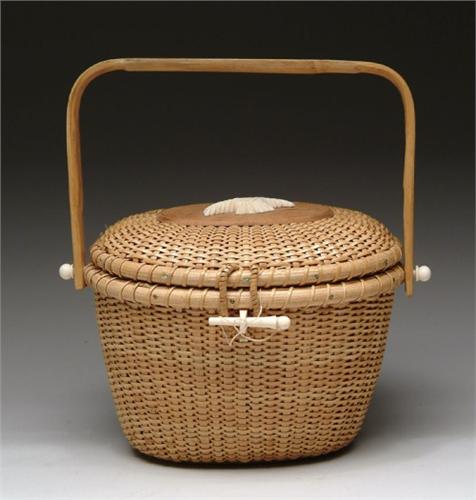 NANTUCKET PURSE WITH CARVING. Traditional Nantucket-shaped purse with carved seagull mounted on lid and also retains original carved pin closure. SIZE: 8-1/2 dia x 7in. h. CONDITION: Clean, original natural finish; generally excellent. 9-26395