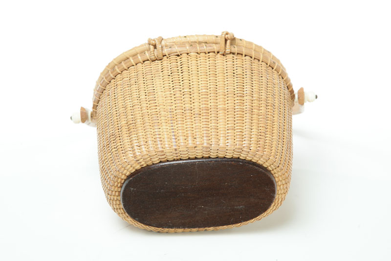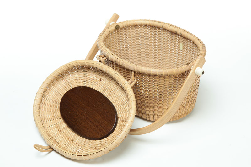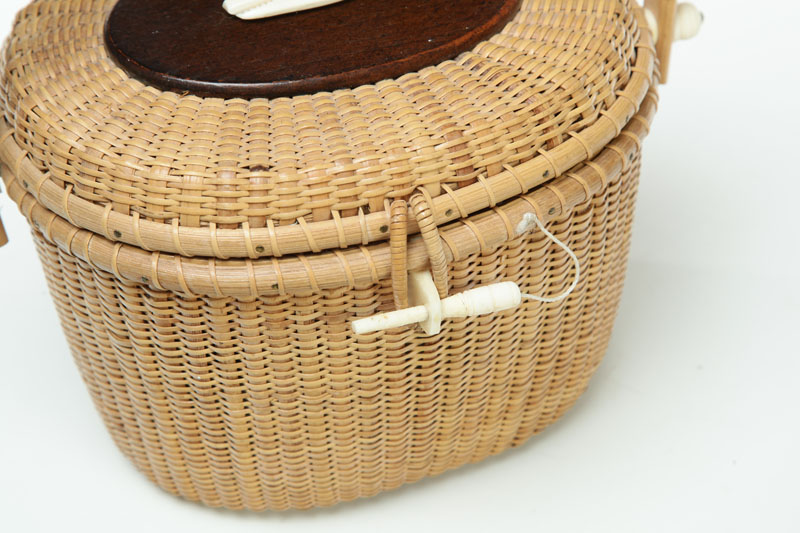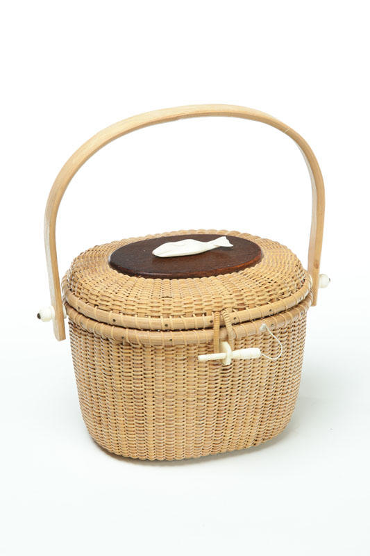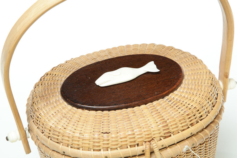 Massachusetts, mid 20th century. Woven cane with wooden disk base and lid, bone and faux ivory fittings and carved whale, 6 1/2"h. plus bentwood swing handle, 9"w.