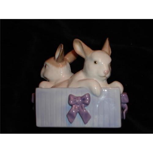 This is the NAO Lladro #1081 two small rabbits or bunnies in a box with bows. Signed NAO Lladro c. daisa 1988. Has some other incised letters on base. Colors are purple, light blue, white, and brown. Does have a rattle of piece of porcelain inside, but no chips, cracks or