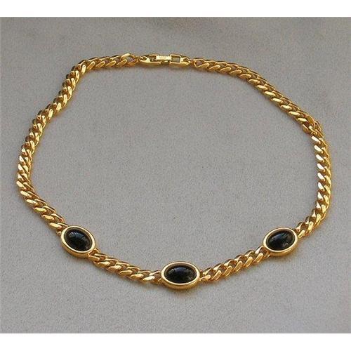 </font></strong>Produced by Napier this elegant necklace epitomizes the high style of costume jewelry made by this company that was founded in 1875. They began to use the Napier name for their jewelry in 1922. This choker styled gold-tone chain, with bezel set, onyx colored enamel oval cabochons, is signed 'Napier Pat Pend' on the fold over safety clasp. The chain is 17.5 inches long and the enameled discs are 3/4 x 1/2 inch approximately. The condition of this vintage necklace is excellent with no wear marks to either the cabochons or chain and clasp.</font>