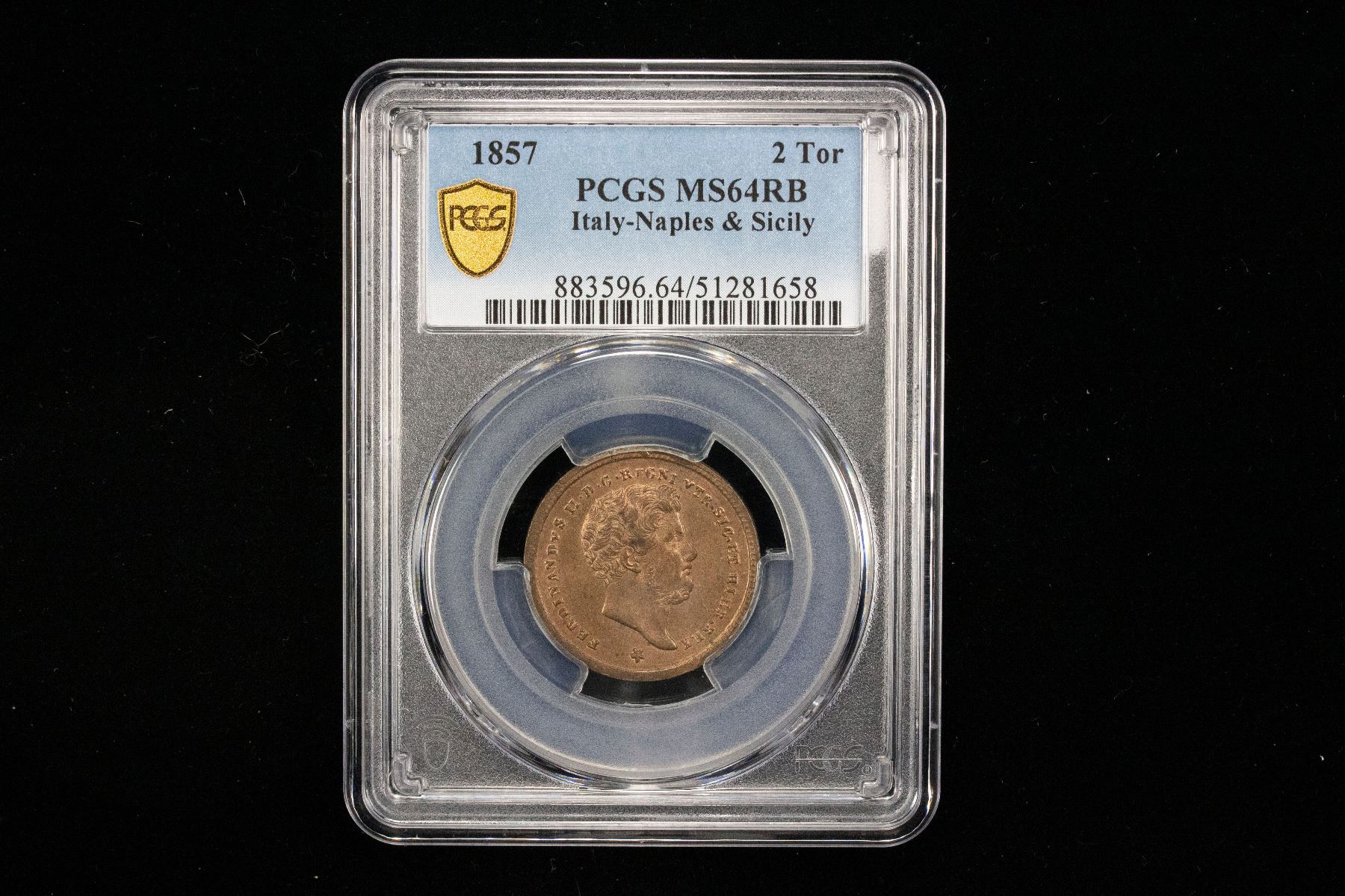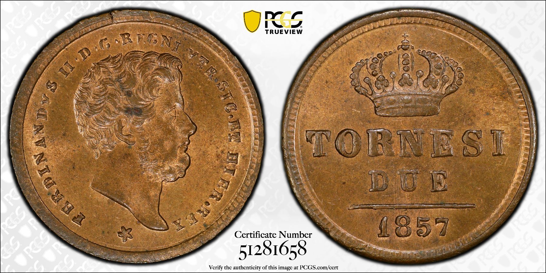NAPLES & SICILY: Ferdinando II, 1830-1859, AE 2 tornesi, 1857, PCGS MS64 RB