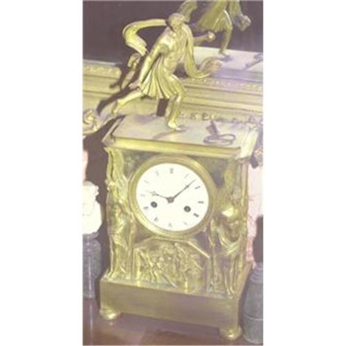 To the stop stands a Roman God and on either side are winged men with neo classical scenes below the clock face. Made in gilt bronze the clock is most impressive and should be given a place of honour.