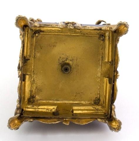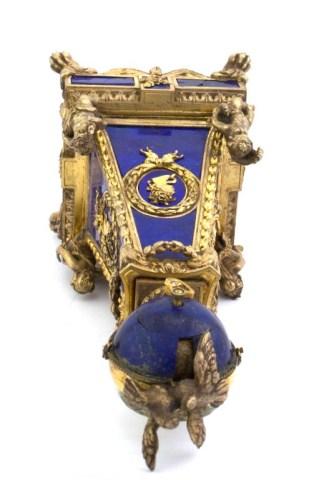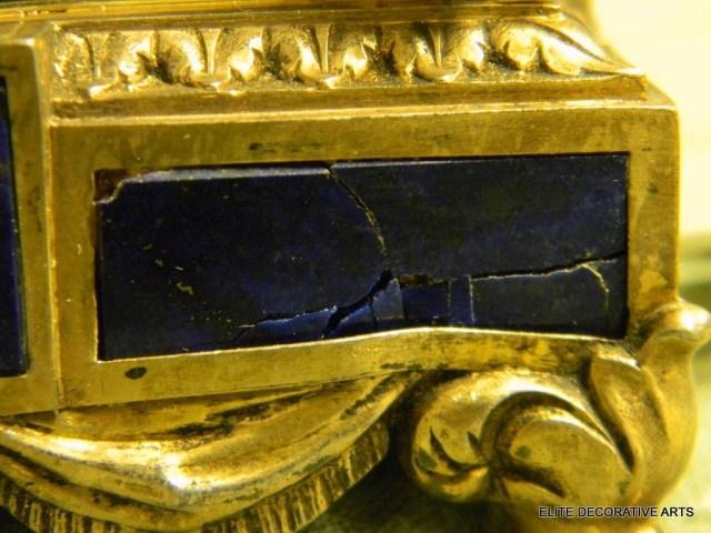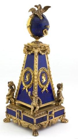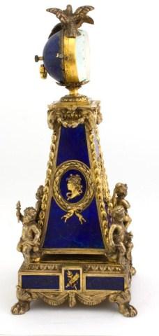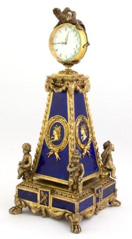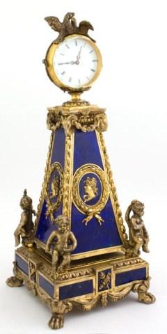 Approx. 9" tall. Standing on 4 feet. With 4 putti & women's cameo mounted onto blue lapis obelisk. Top of obelisk adorned with ram's heads. The clock itself approx 2" diameter. Has a pair of doves kissing to the top. Clock is in working condition. Markings to side of obelisk (see photos).