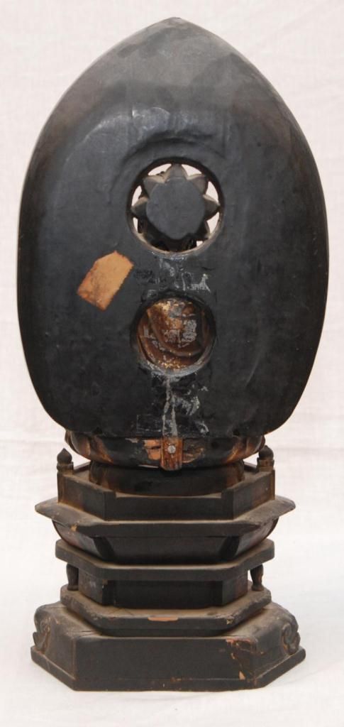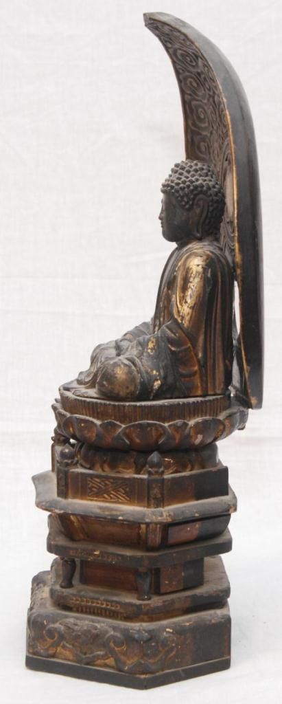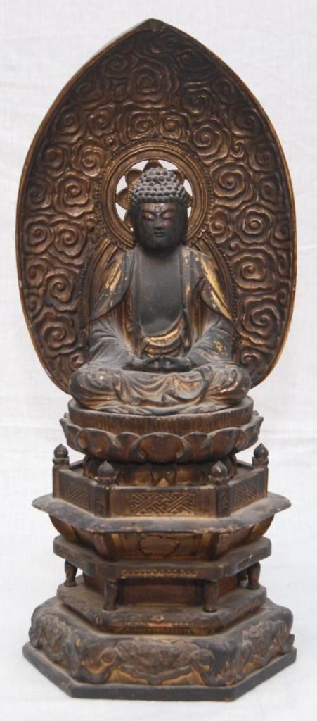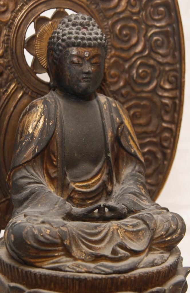 An antique Japanese seated Buddha figure. He is depicted in a seated position with floral figural leaf shade behind him. He is seated on stylized lotus blossom throne with fenced base. Nara period design but probably made Meiji to Taisho. Measures 18 1/4" height x 8 1/2" width (46.3cm x 21.6cm). Total weight of 1212 grams.