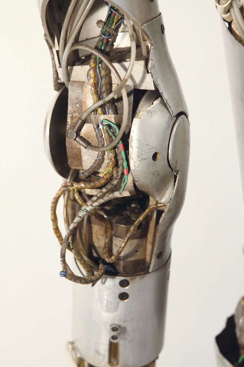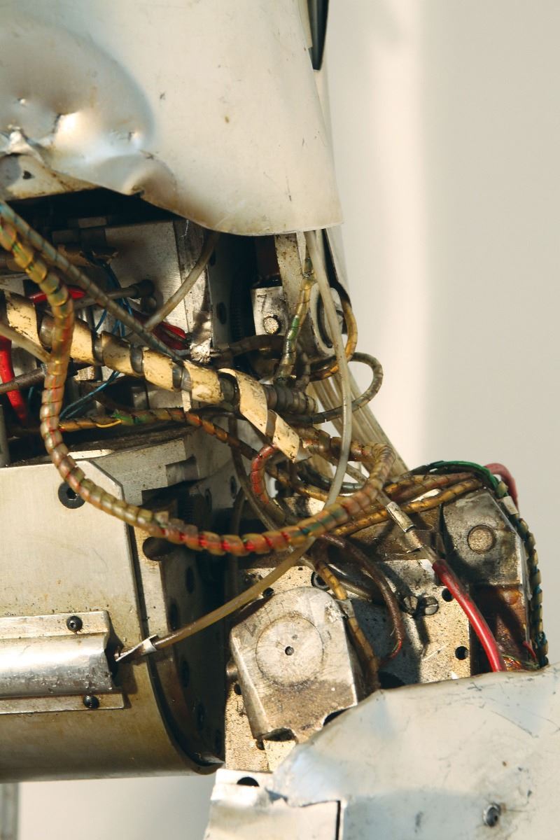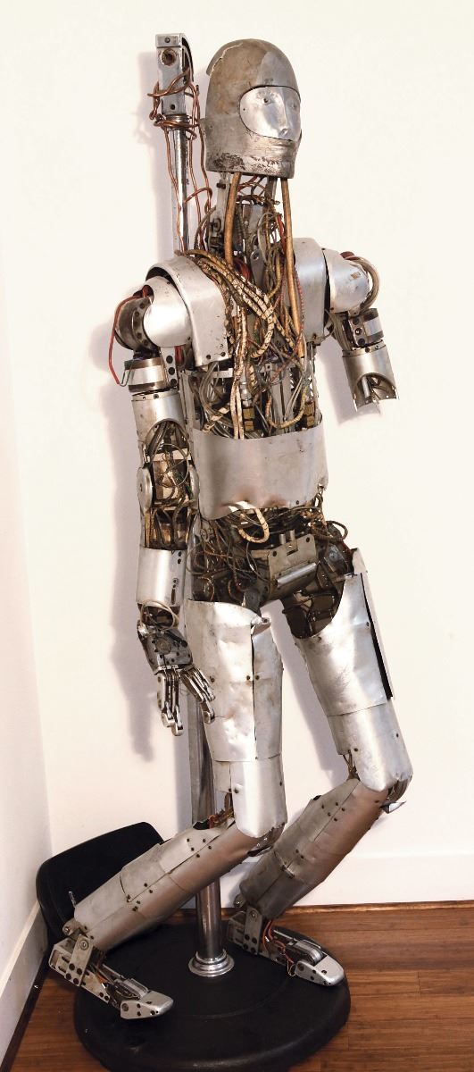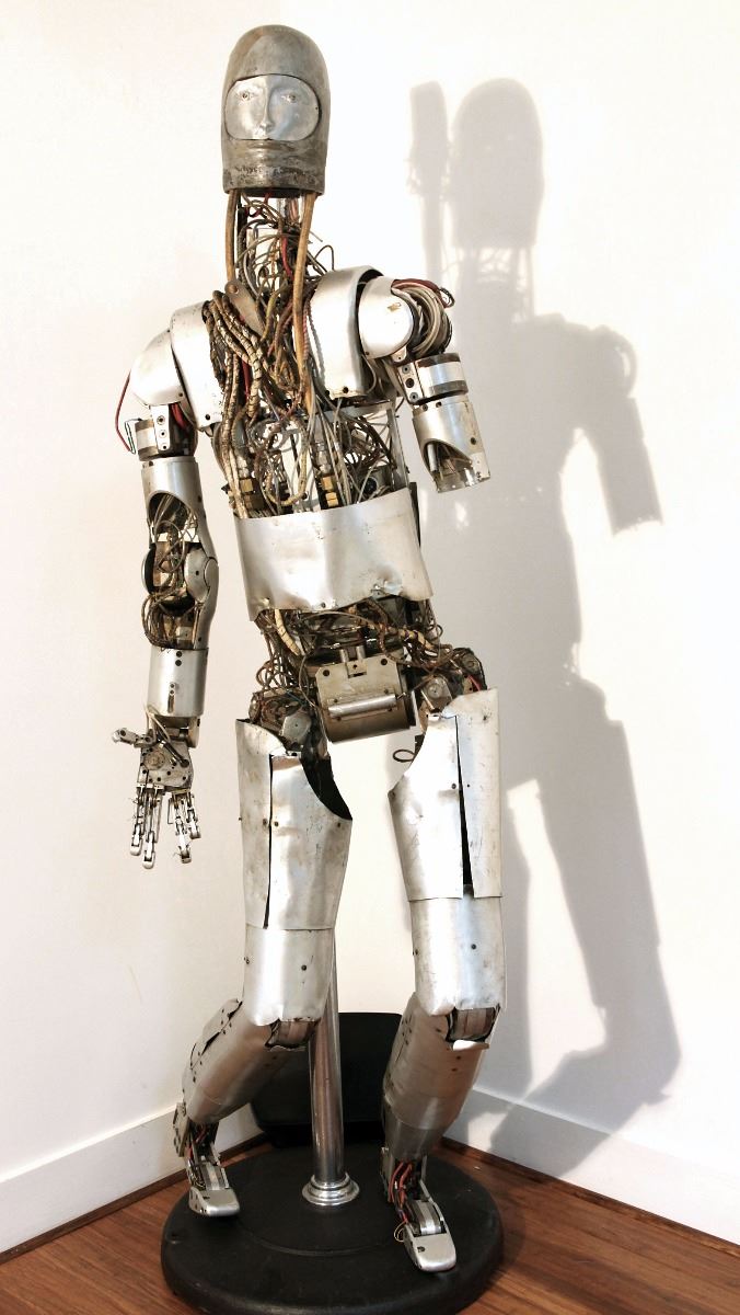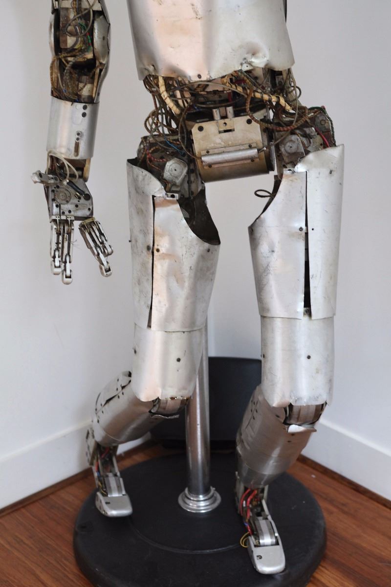 Weighing 230 pounds, the dummy was made height adjustable from 5´ 5? to 6´ 2? so that it could represent the average American male from the fifth to ninety-fifth percentile. The movements of the robot were enabled by hydraulic actuators powered by oil flowing through a nylon-tube circulatory system, and controlled by the operator from a separate console. The exterior is covered with a 1/32-inch thick aluminum skin with cutaways to allow freedom of motion, and the facial section of the fiberglass head is removable for access to the interior connections. The dummy is missing a forearm and hand, has various scuffs and dings to the body, and some of the wiring is frayed or damaged.