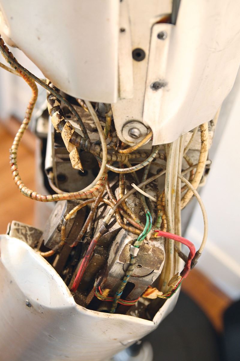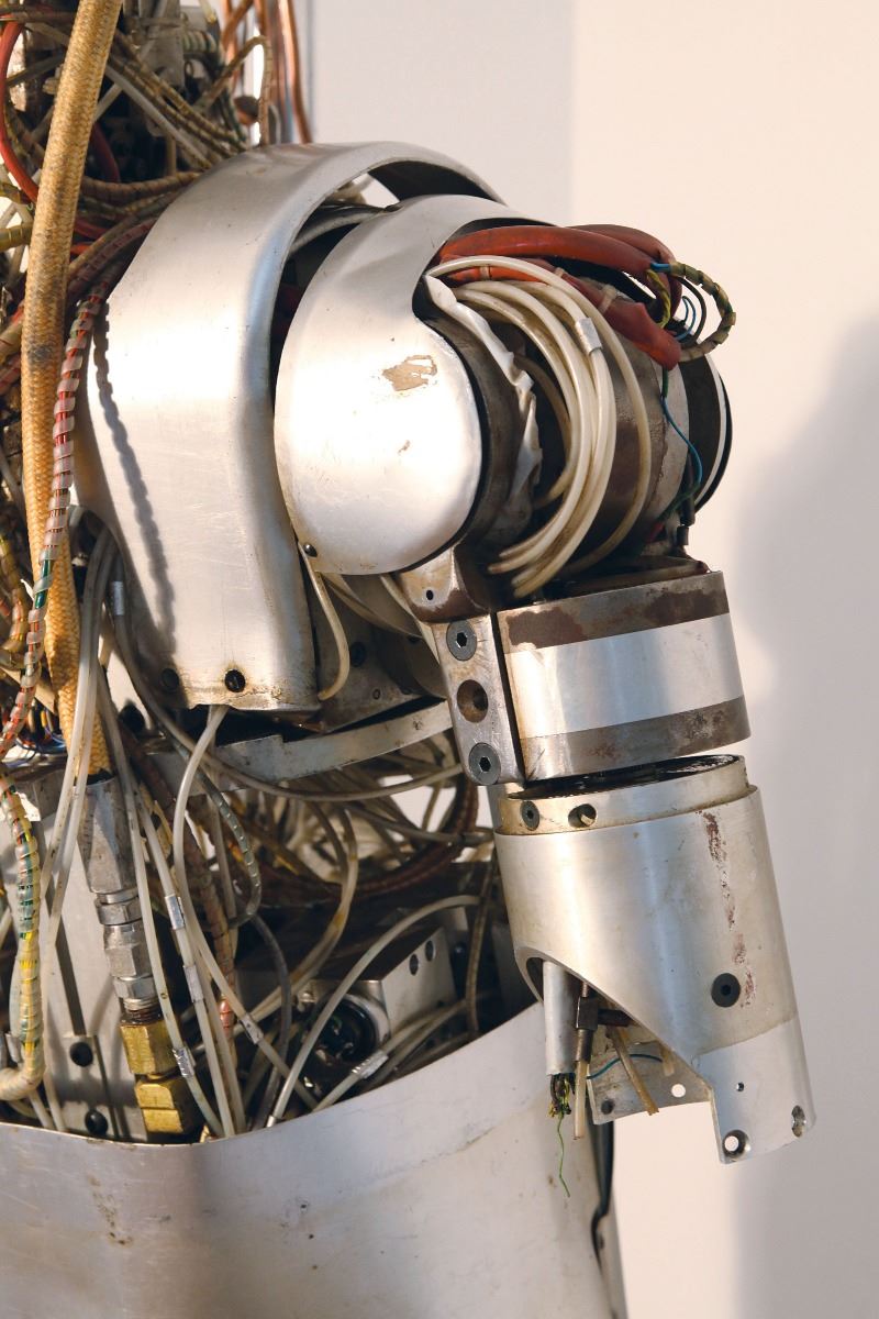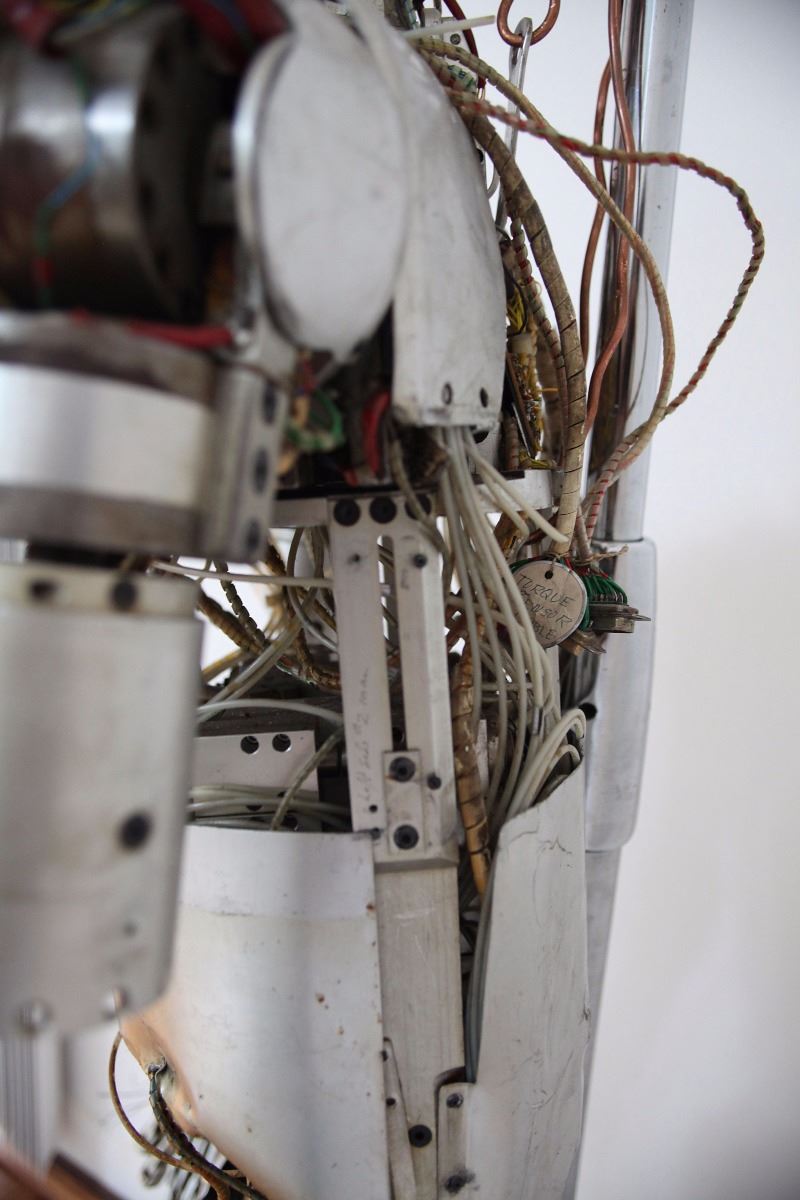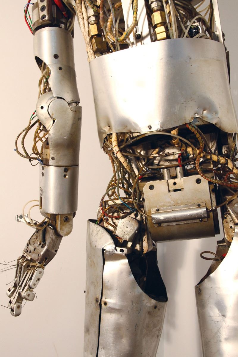 Weighing 230 pounds, the dummy was made height adjustable from 5´ 5? to 6´ 2? so that it could represent the average American male from the fifth to ninety-fifth percentile. The movements of the robot were enabled by hydraulic actuators powered by oil flowing through a nylon-tube circulatory system, and controlled by the operator from a separate console. The exterior is covered with a 1/32-inch thick aluminum skin with cutaways to allow freedom of motion, and the facial section of the fiberglass head is removable for access to the interior connections. The dummy is missing a forearm and hand, has various scuffs and dings to the body, and some of the wiring is frayed or damaged.