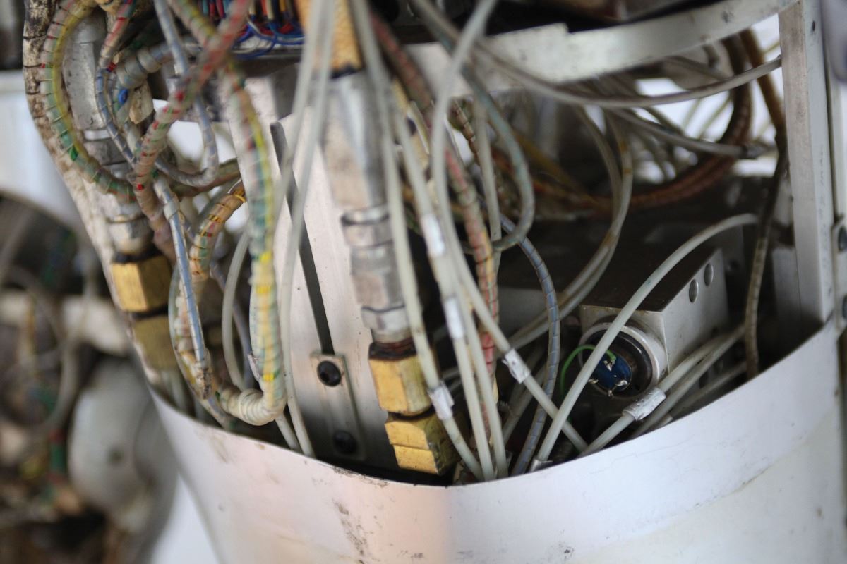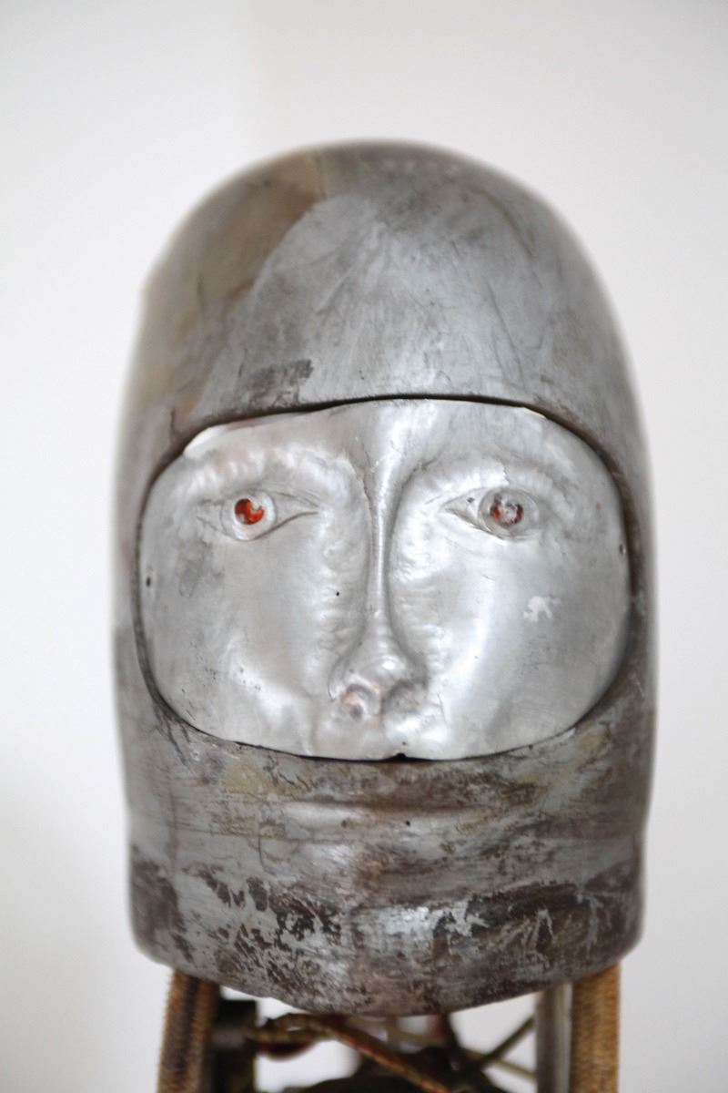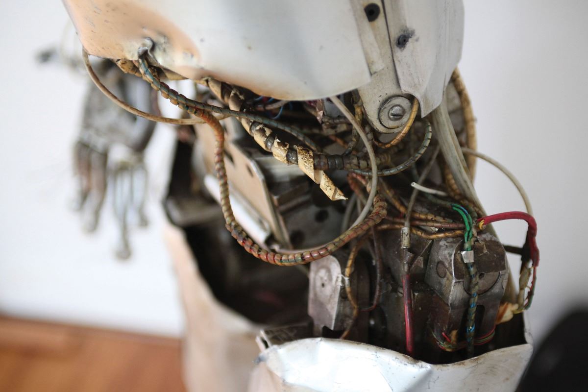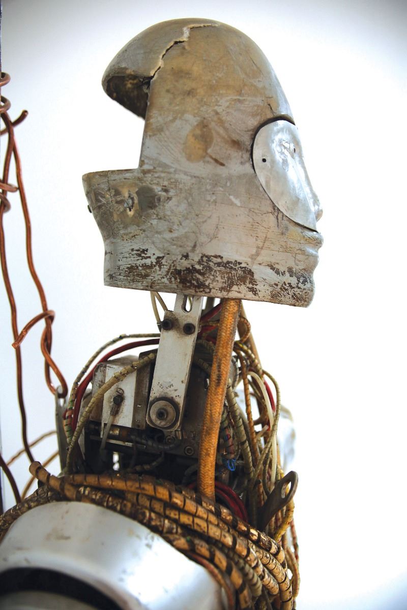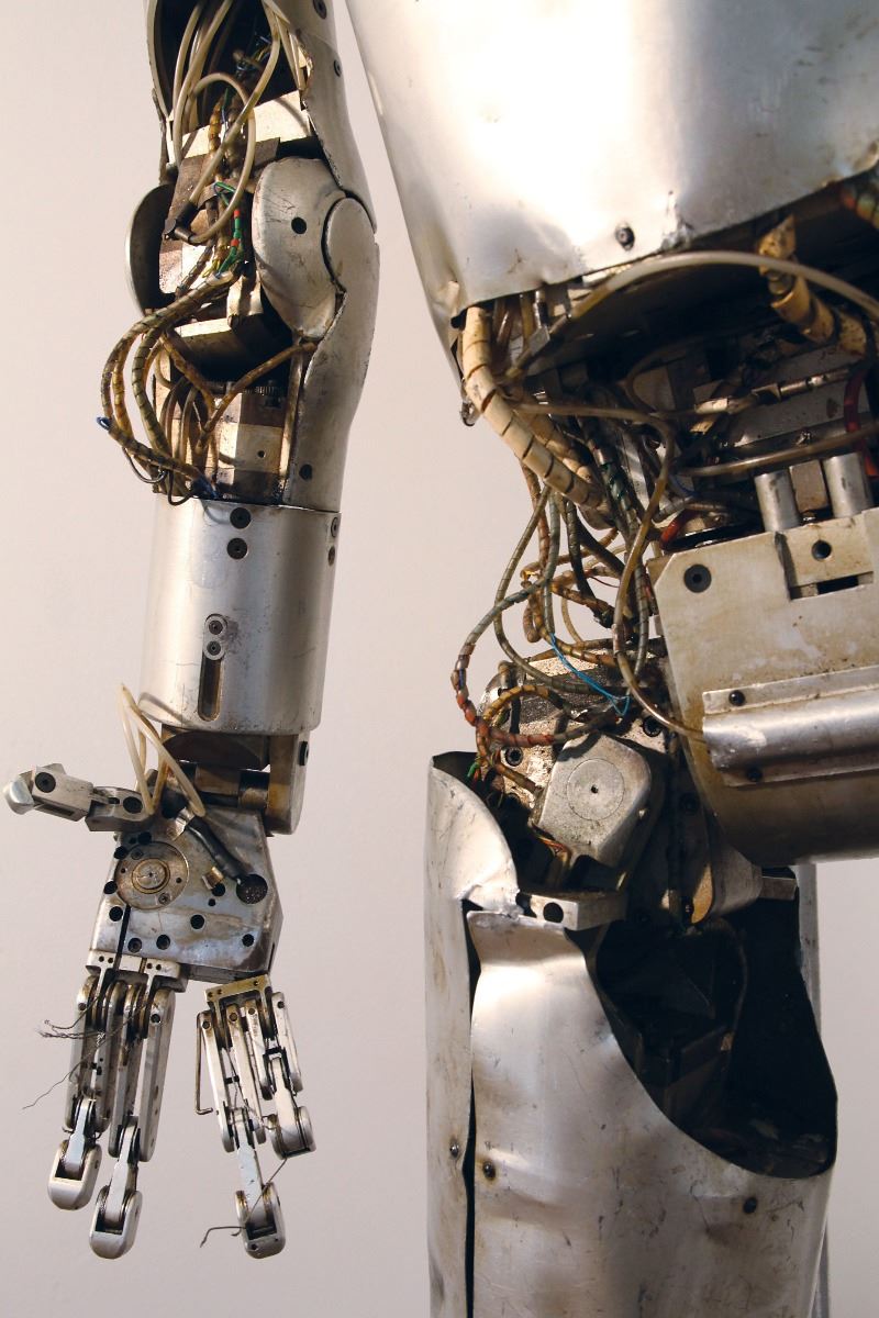 Weighing 230 pounds, the dummy was made height adjustable from 5´ 5? to 6´ 2? so that it could represent the average American male from the fifth to ninety-fifth percentile. The movements of the robot were enabled by hydraulic actuators powered by oil flowing through a nylon-tube circulatory system, and controlled by the operator from a separate console. The exterior is covered with a 1/32-inch thick aluminum skin with cutaways to allow freedom of motion, and the facial section of the fiberglass head is removable for access to the interior connections. The dummy is missing a forearm and hand, has various scuffs and dings to the body, and some of the wiring is frayed or damaged.