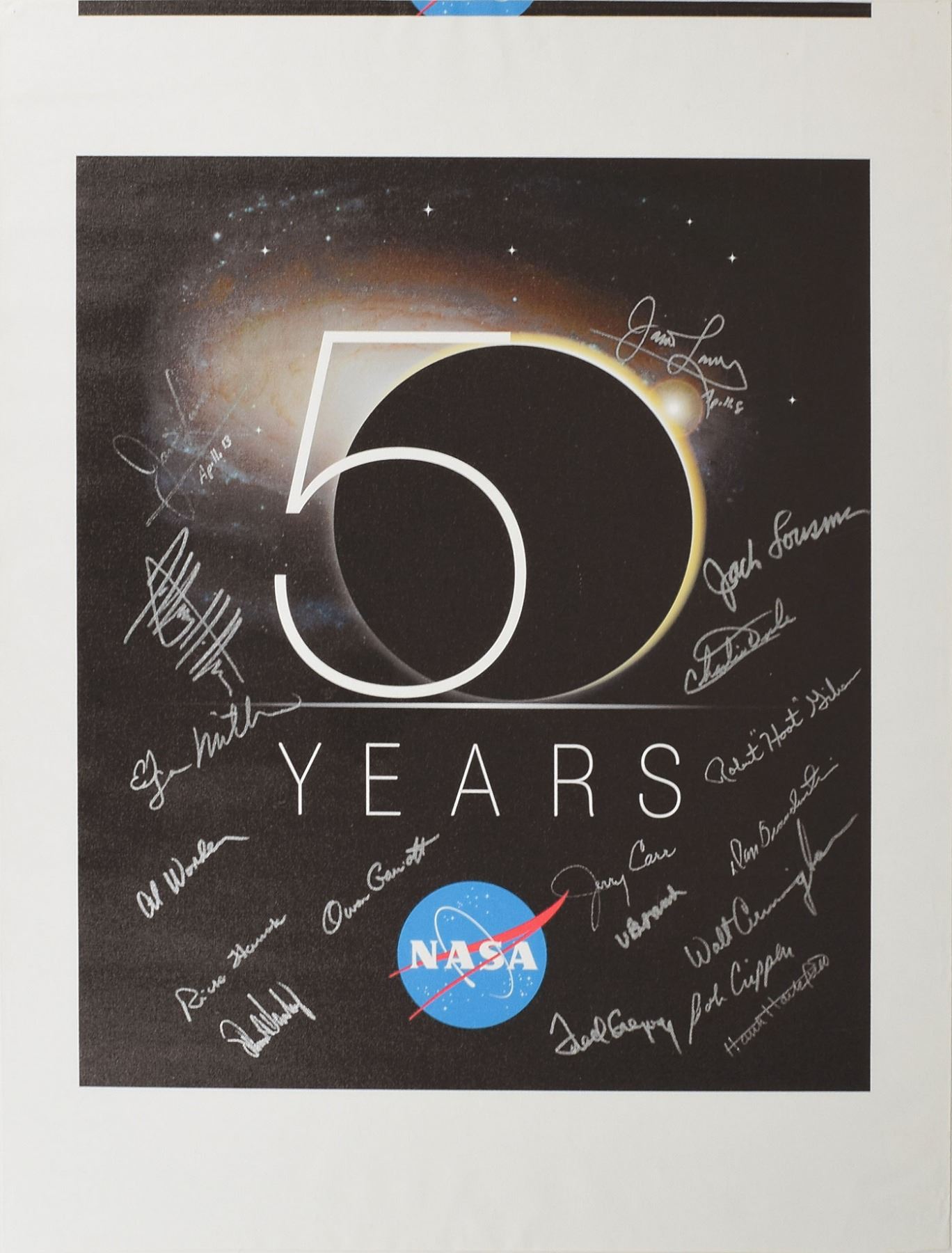 Highly appealing color 24 x 31.75 canvas print for the 50th anniversary of NASA, showing a stunning solar eclipse above the classic 'meatball' logo, signed in silver ink by 17 astronauts, including: James Lovell (2), Edgar Mitchell, Walt Cunningham, Charlie Duke, Al Worden, Vance Brand, Jack Lousma, Jerry Carr, Robert 'Hoot' Gibson, Rick Hauck, Owen Garriott, Fred Gregory, Bob Crippen, Hank Hartsfield, Dan Brandenstein, Jeffrey Hoffman, and one other. Rolled and in fine condition.