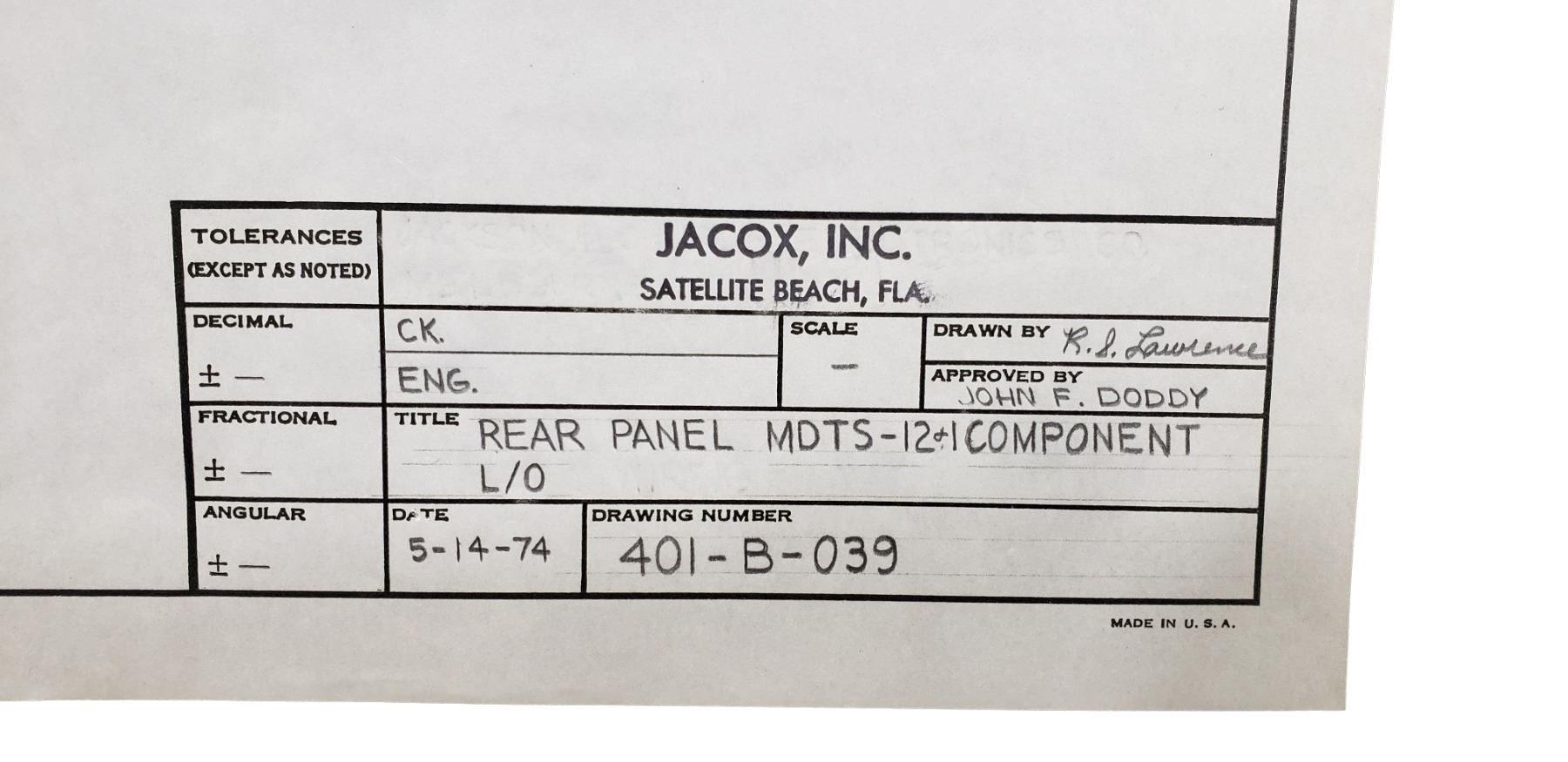 NASA Apollo Mission Blueprint Schematic Piece is 17 1/2" x 11 1/2" All items are from the Estate of Charles Bell space auction in May of 2000 All item for this Auction Located in in Hollywood Florida Warehouse For Shipping Call today for quote they have item numbers and Pak Mail is available for all your custom packaging and shipping needs. We can package, palletize, crate, insure and ship to any Domestic or International location. All packaging and shipping fees must be paid in full before shipment is released. On international shipments, consignee is responsible for all Duties, Taxes, Customs Clearance or any destination fees that apply. Please visit our website @ www.pakmail.com/us770 for contact information or to get a quote. (Let us know you are a winning bidder from the Puckett auction so we can correctly arrange pick up for your item) Telephone number is 954 522 4550 Pak Mail www.pakmail.com/us770 email us770@pakmail.com Monday Friday 9 am to 6pm Sat 10 am 3 pm