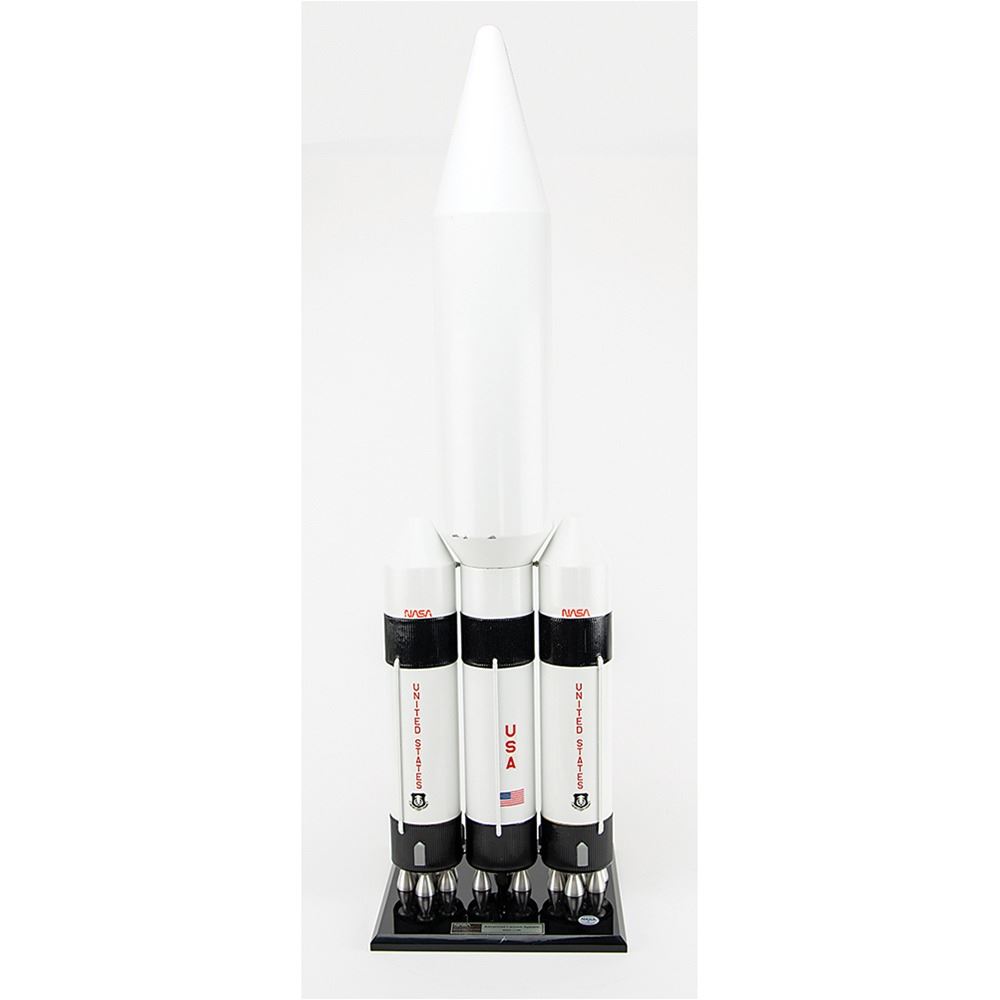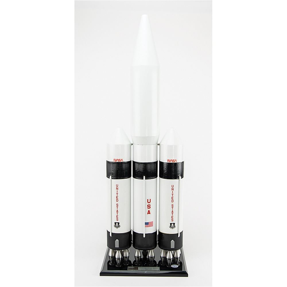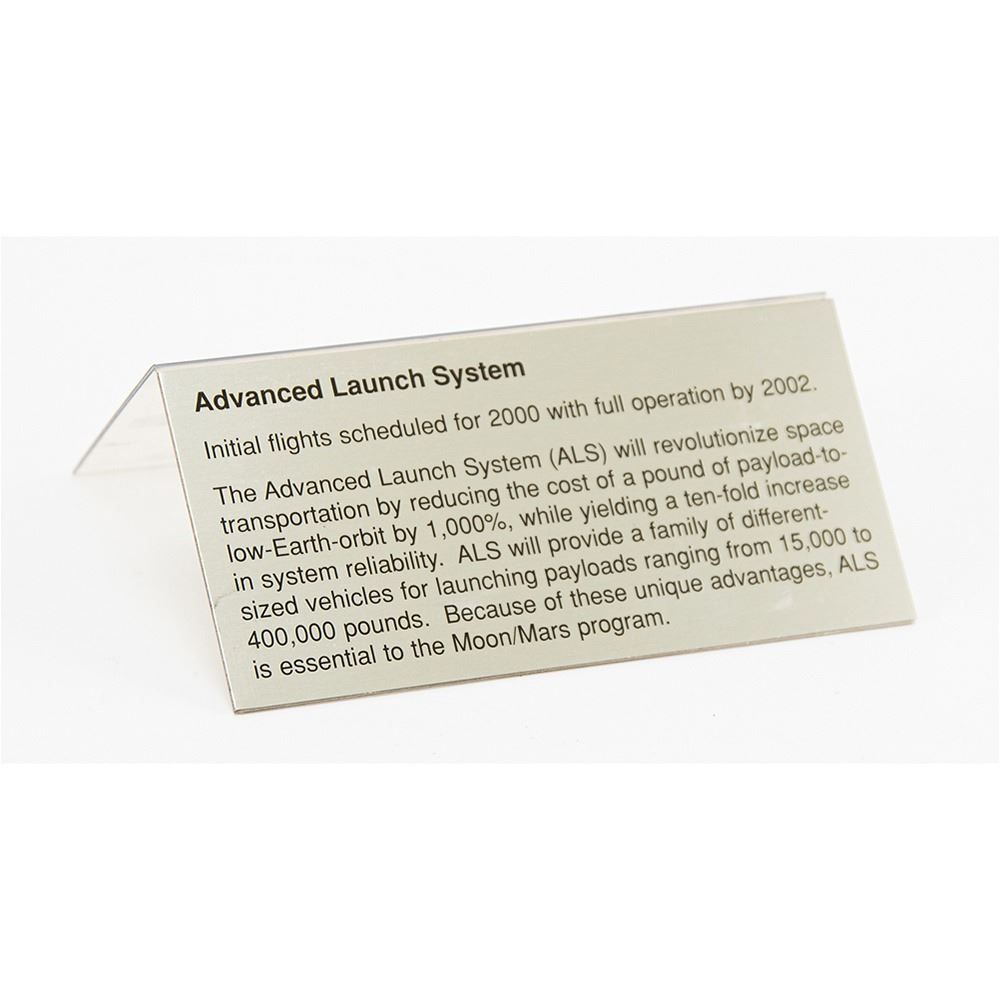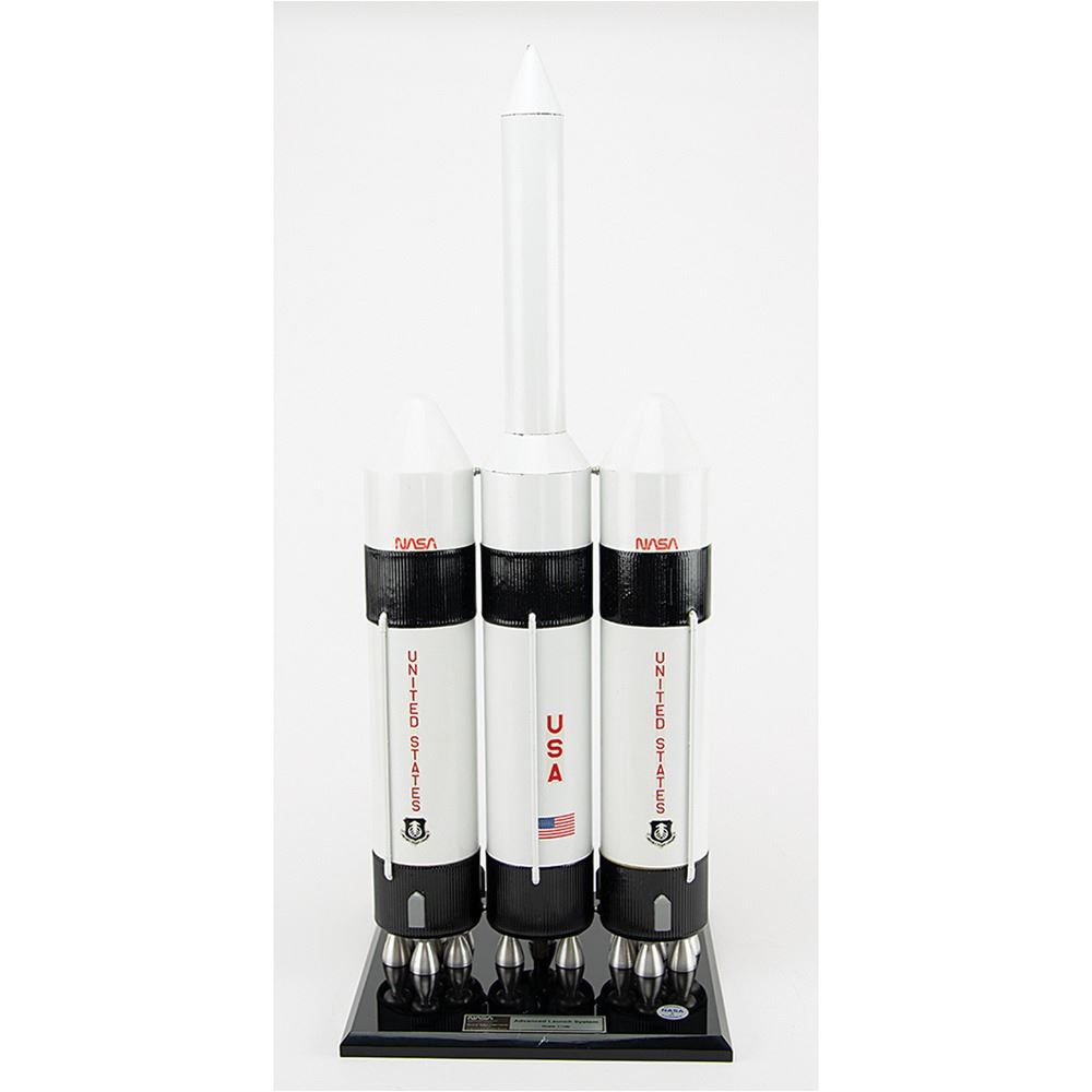Fantastic original 1:100 scale model of the Advanced Launch System (ALS) built by the George C. Marshall Space Flight Center's model shop, featuring three different payload modules ranging from small to large. Depending on the module installed on top, the model measures from 30è to 43è tall, and is set on a 12è x 12è base, with Marshall Space Flight Center Graphics and Models Branch plate reading: "Advanced Launch System, Scale 1:100." A descriptive plaque outlines the program's mission: "Advanced Launch System. Initial flights scheduled for 2000 with full operation by 2002. The Advanced Launch System (ALS) will revolutionize space transportation by reducing the cost of a pound of payload-to-low-Earth-orbit by 1,000%, while yielding a ten-fold increase in system reliability. ALS will provide a family of different-sized vehicles for launching payloads ranging from 15,000 to 400,000 pounds. Because of these unique advantages, ALS is essential to the Moon/Mars program." Housed in its large 34è x 15è x 15è wooden crate. In fine condition, with a few paint chips to the smallest payload module and heavy wear to the exterior of the crate.