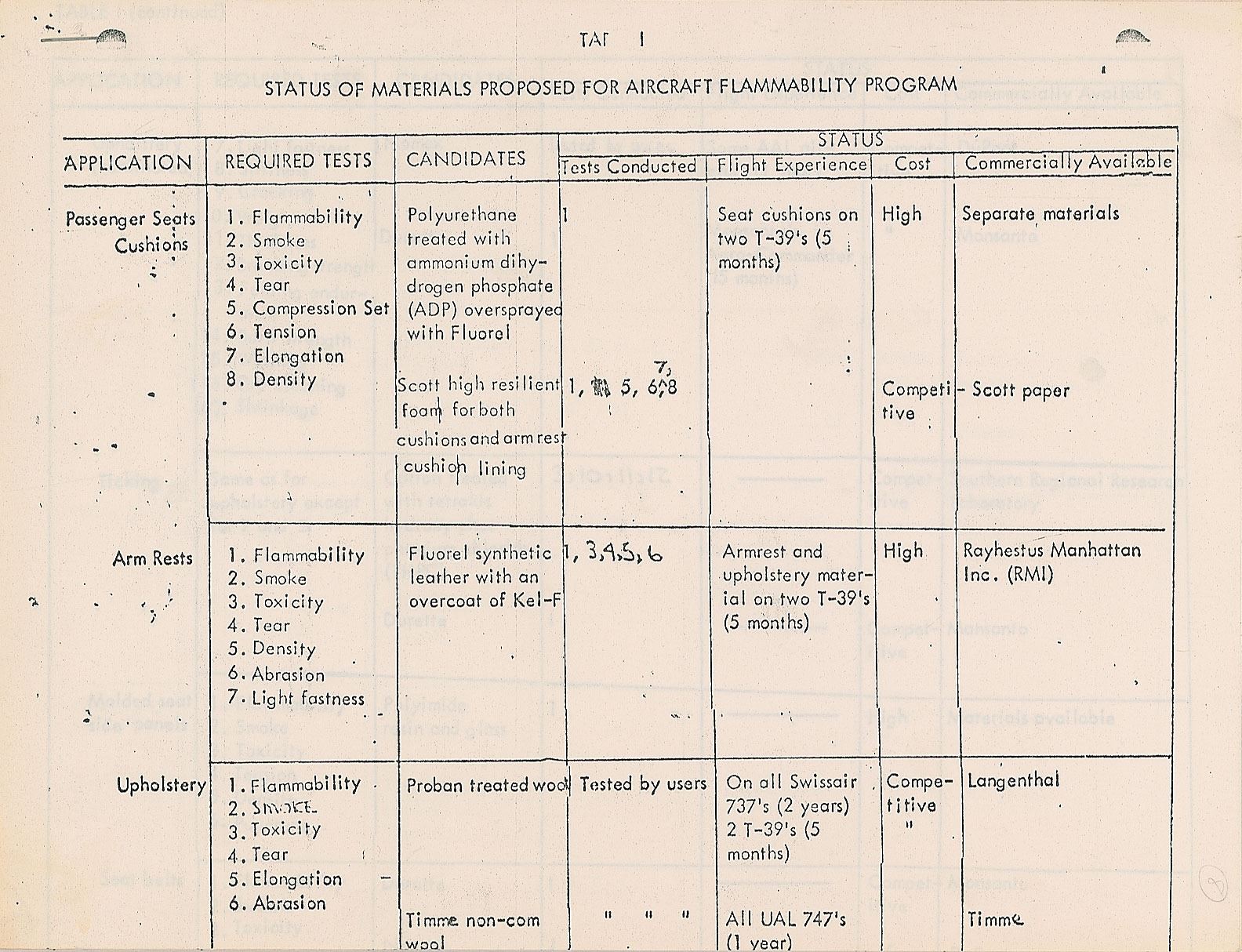 Scarce group lot of 24 official color glossy 10 x 8 red-numbered NASA photos documenting tests made by NASA’s Aircraft Flammability Program in October 1975, consisting of magazine numbers 70, 71, 72 (14), and 73 (8), with images documenting the fire-retardant material used, the outside of the NASA test aircraft, and several images of the inside of the aircraft from before and after the controlled burnings. Also included: two identical official glossy NASA photos of used materials and comparative charts for “Physical” and “Fireproof” characteristics of aircraft decorative panels; a packet entitled “Status of Materials Proposed for Aircraft Flammability Program,” listing applications, required tests, candidates, and status; and a heat chart indicating temperatures and resulting damage to cabin. In overall fine to very fine condition.