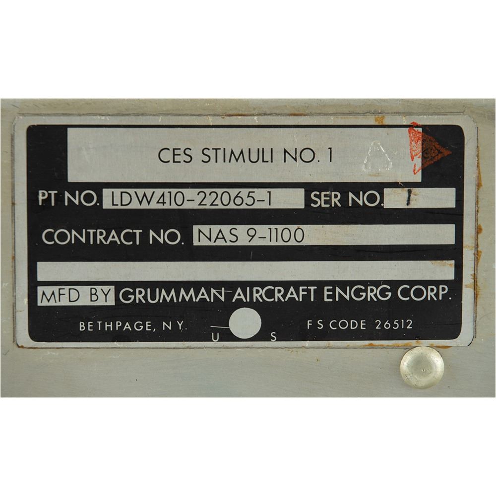 NASA/Apollo Lunar Module CES Stimuli #1 Control Panel, measuring approximately 19Ë x 7Ë x 20Ë, with its Grumman identification plate on the reverse: "CES Stimuli No. 1, Pt. No. LDW410-22065-1, Ser. No. 1, Contract No. NAS9-1100." The panel's face has three banks of identical buttons, marked "No. 1," "No. 2," and "No. 3," and three adjustment knobs for "Amplitude." In very good to fine condition, with most buttons sticky.
