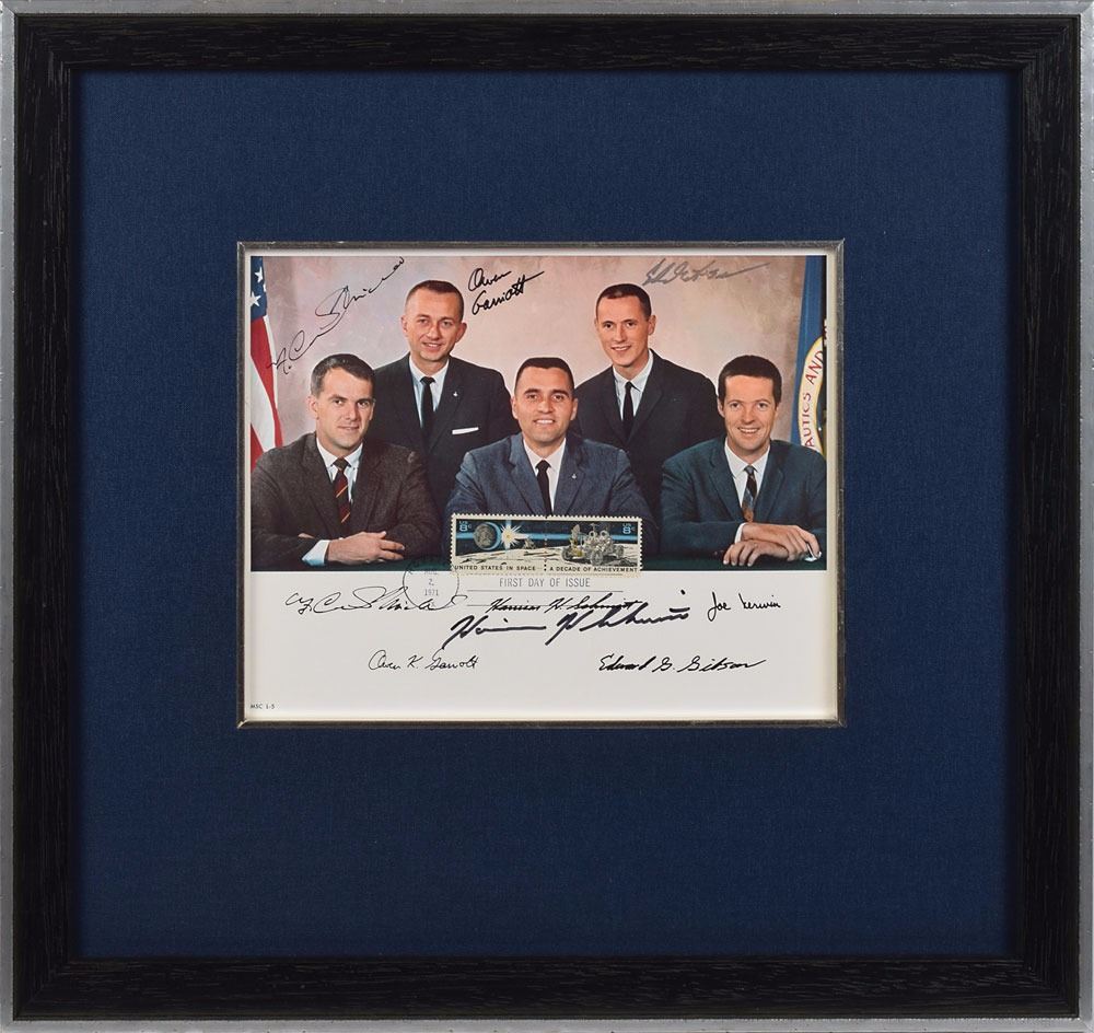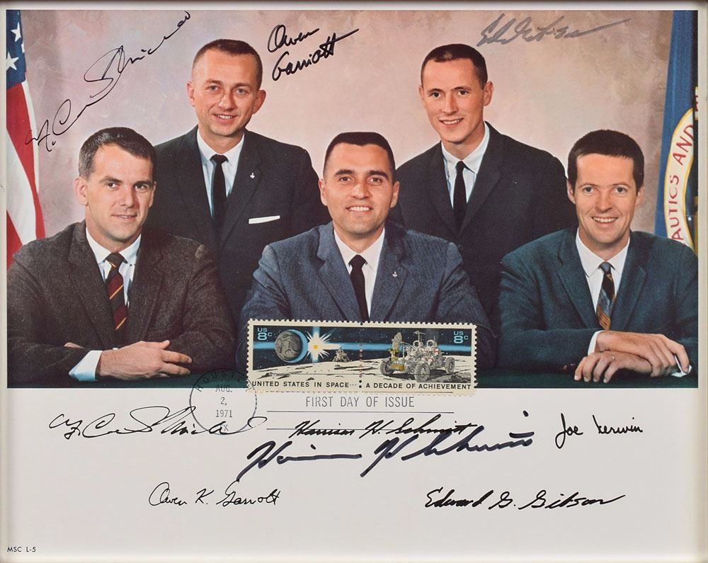 Official color semi-glossy 9.75 x 7.75 NASA lithograph of NASA Astronaut Group 4, signed in black felt tip, "F. Curtis Michel," "Owen Garriott," "Ed Gibson," and "Harrison H. Schmitt." Photo bears two affixed eight-cent stamps and a postmark dated August 2, 1971. Cloth-matted and framed to an overall size of 18 x 17. In fine condition.