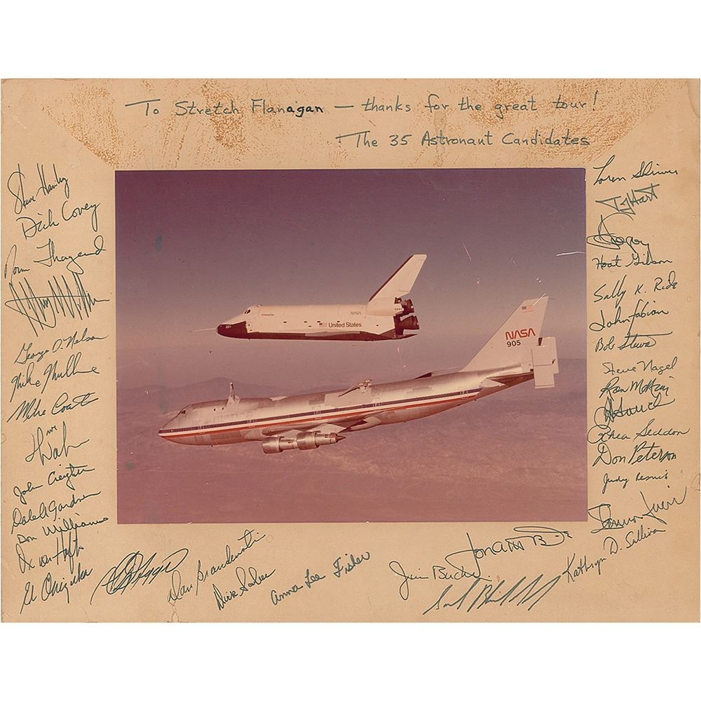 Highly sought-after official color semi-glossy 9.5 x 7 NASA photo of the prototype Space Shuttle Enterprise lifting away from the the Shuttle Carrier Aircraft during the Approach and Landing Tests of 1977, affixed to the original 14 x 11 mount, which is signed around the borders in black ink and felt tip by the 35 members of NASA Astronaut Group 8, including: Guion Bluford, Daniel Brandenstein, James Buchli, Michael Coats, Dick Covey, John Creighton, John Fabian, Anna Fisher, Dale Gardner, Bob Gibson, Fred Gregory, S. David Griggs, Terry Hart, Rick Hauck, Steven Hawley, Jeffrey Hoffman, Shannon Lucid, Jon McBride, Ron McNair, Mike Mullane, Steven Nagel, George D. Nelson, Ellison Onizuka, Judy Resnik, Sally Ride, Dick Scobee, Rhea Seddon, Brewster Shaw, Loren Shriver, Robert Stewart, Kathy Sullivan, Norman Thagard, James D. Van Hoften, David Walker, and Donald Williams. An unknown hand has added an inscription to the upper border: "To Stretch Flanagan—thanks for the great tour! The 35 Astronaut Candidates." In very good to fine condition, with staining to both the mount and the image. The Astronaut Class of 1978, otherwise known as the 'Thirty-Five New Guys,' was NASA’s first new group of astronauts since 1969. This class was notable for many reasons, including having the first women, African-American, and Asian-American astronauts. Four members of this group—Dick Scobee, Judith Resnik, Ellison Onizuka, and Ron McNair—died in the Space Shuttle Challenger disaster.