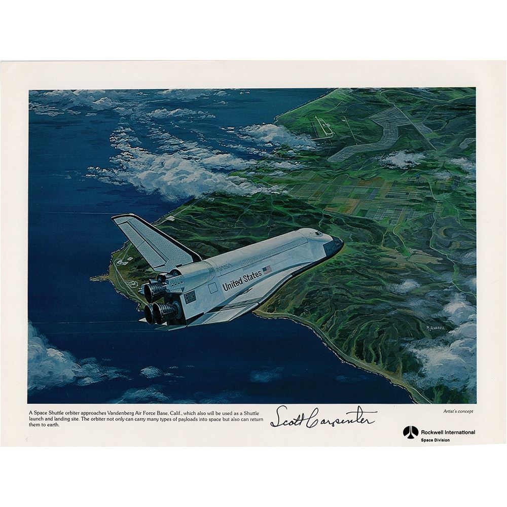 Group of four color lithographs, prints, and photos signed by Apollo astronauts, ranging in size from 10.75 x 8.25 to 8 x 10, including: Charlie Duke (moonwalker), Gordon Cooper (Mercury, Gemini), Wally Schirra, (Mercury, Gemini, Apollo), and Scott Carpenter (Mercury). In fine condition.