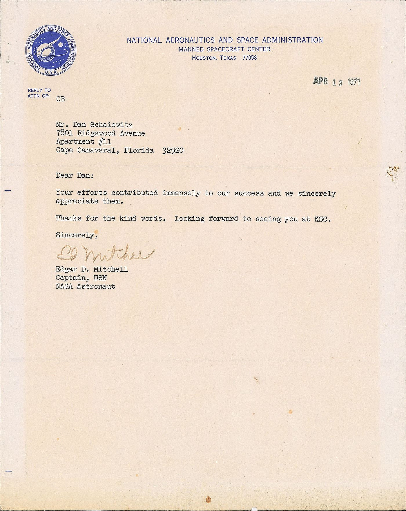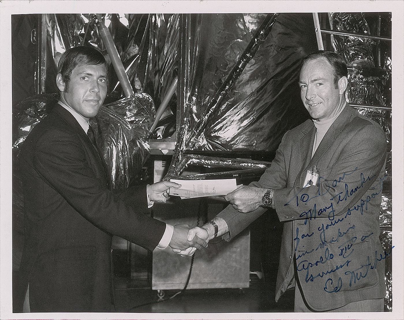 Two items signed by astronaut Edgar Mitchell: a glossy 10 x 8 photo of Edgar Mitchell presenting Dan Schaiewitz with the Snoopy Award, signed and inscribed in black felt tip, "To Dan, Many thanks for your support in making Apollo XIV a success, Ed Mitchell"; and a TLS signed "Ed Mitchell," one page, 8 x 10, April 13, 1971, NASA letterhead, addressed to Schaiewitz, in full: "Your efforts contributed immensely to our success and we sincerely appreciate them. Thanks for the kind words. Looking forward to seeing you at KSC."