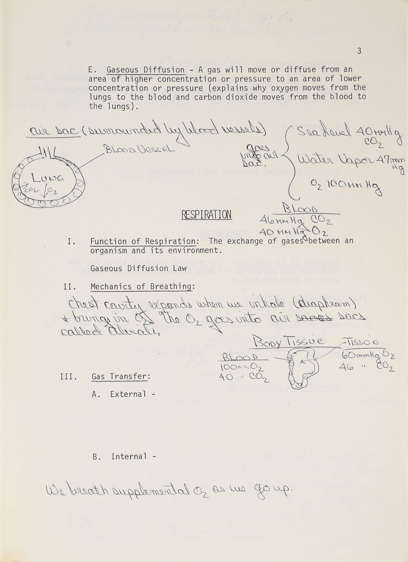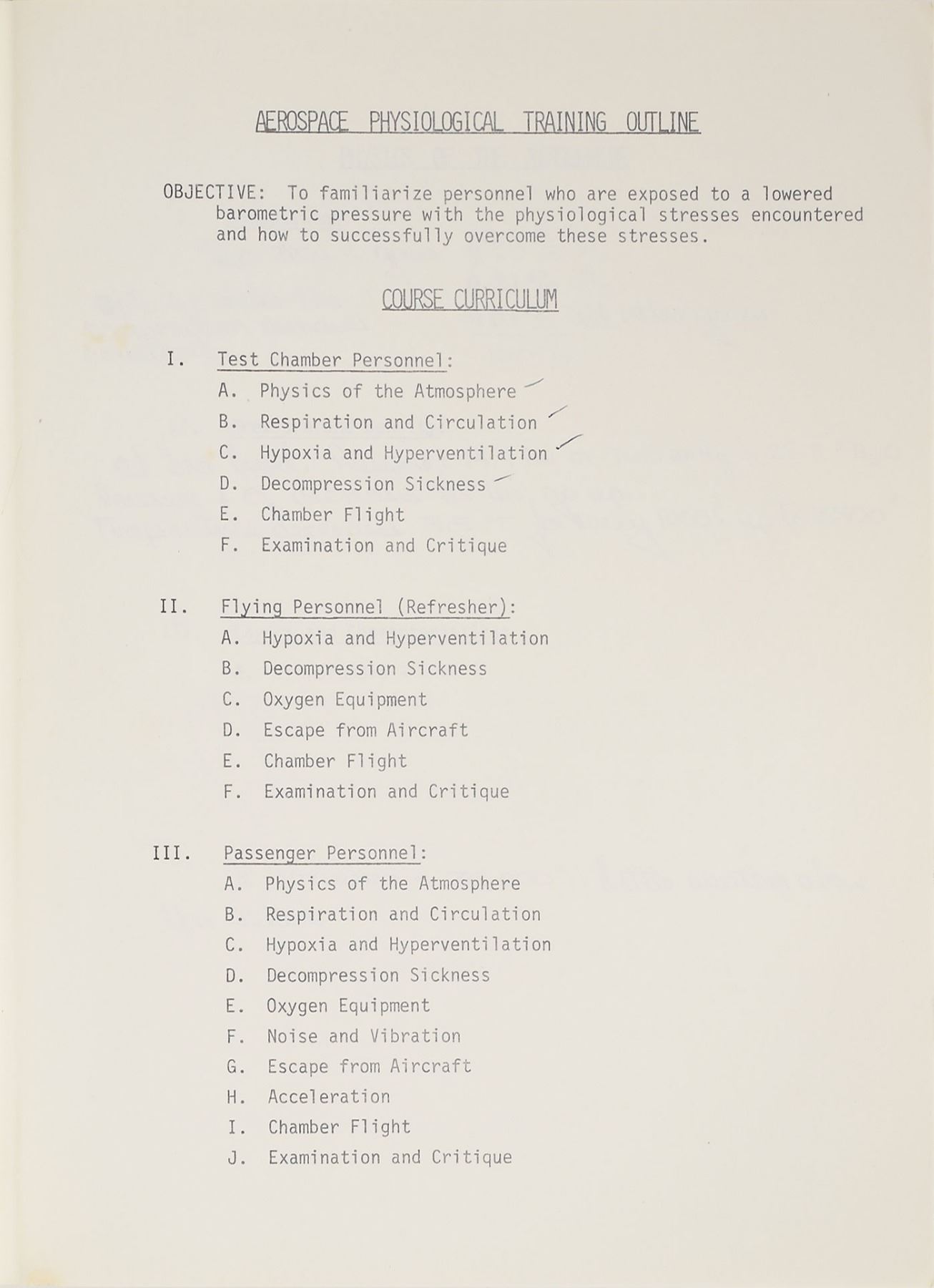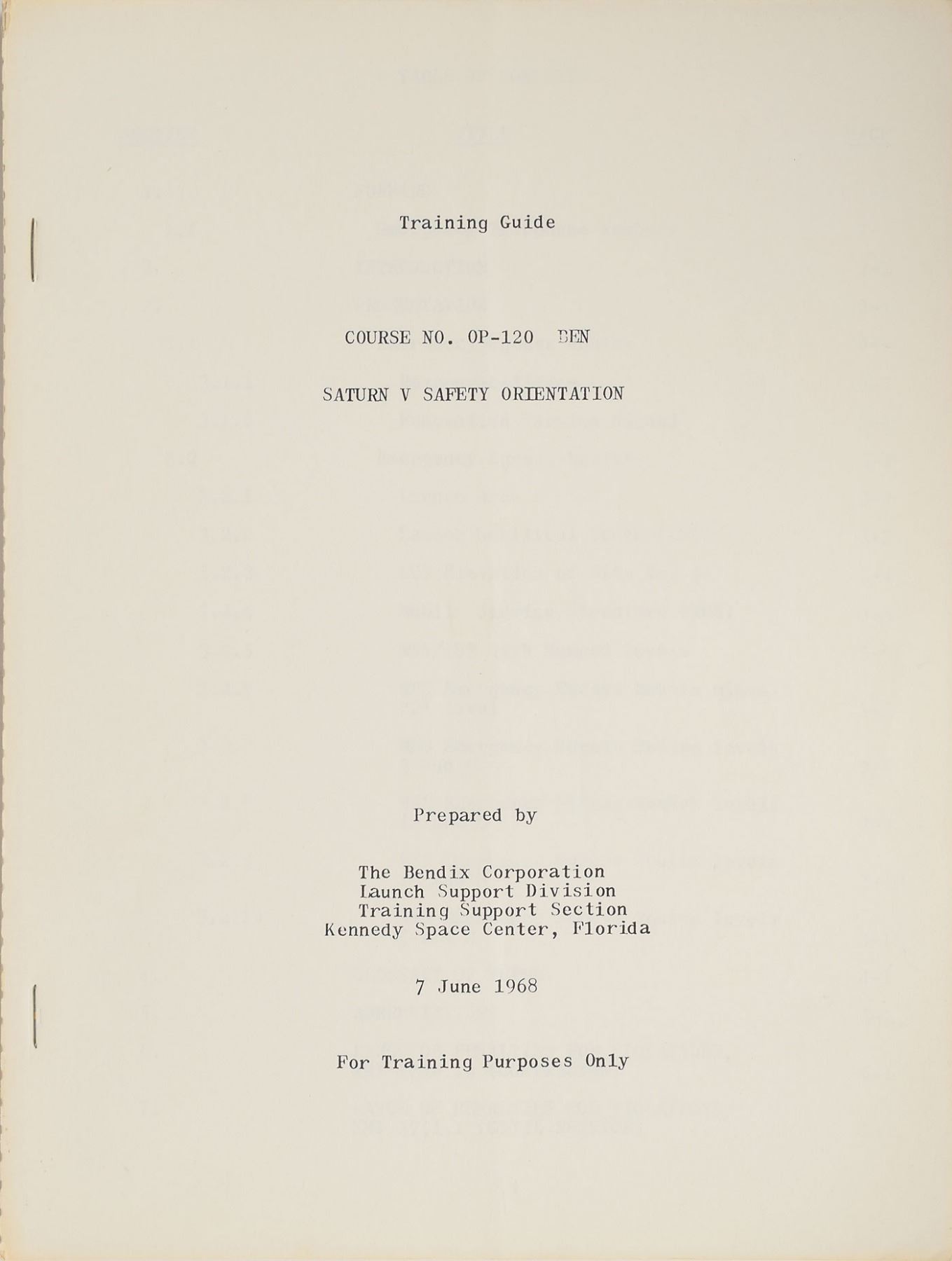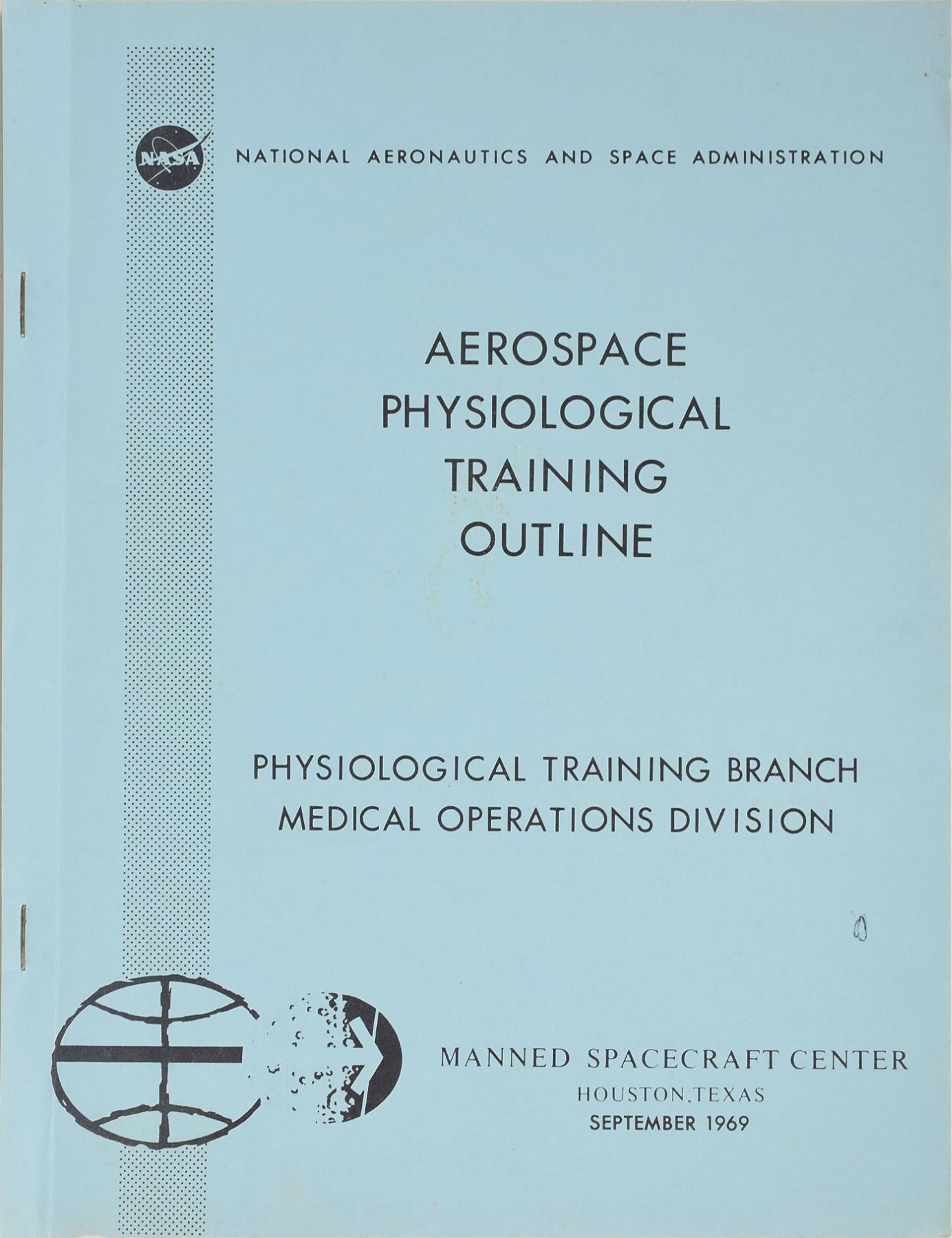 A staple-bound manual entitled, "Aerospace Physiological Training Outline," 8 x 10.5, 19 pages, by NASA's Physiological Training Branch, Medical Operations Division, September 1969. The manual has been extensively annotated throughout by Dan Schaiewitz, an Extravehicular Crew Training Engineer at Kennedy Space Center, with detailed notes on the physiological stresses that may be experienced by a human in space. Accompanied by a manual entitled "Training Guide, Course No. OP-120 BEN, Saturn V Safety Orientation," dated June 7, 1968, which is not annotated inside.