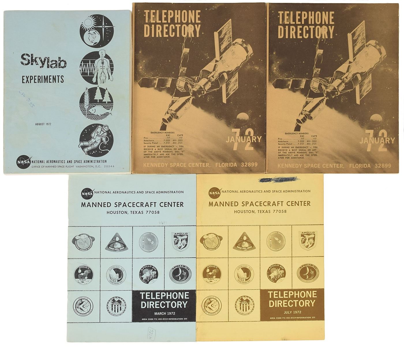 Four vintage telephone directories: a pair of NASA telephone directories for the Manned Spacecraft Center in Houston, Texas, for March and July 1972, both 8 x 10.5, 55 and 62 pages; and two copies of the telephone directory for Florida's Kennedy Space Center from January 1972, 8 x 10.75, 74 pages.
