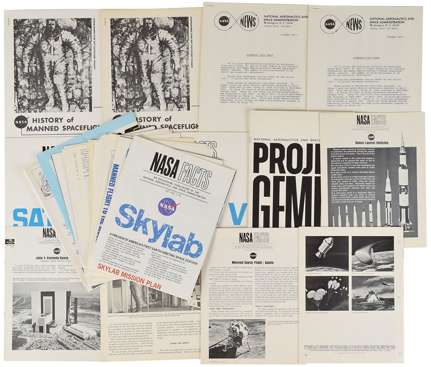 Collection of 21 NASA Facts newsletters, dated between 1966 and 1972, including many duplicates, and nine unfolding into large and extremely visual posters. The posters are for the Saturn V rocket (3), United States Launch Vehicles, and the Gemini, Apollo (2), and Skylab (2) programs. Also includes two NASA packets entitled “History of Manned Spaceflight,” from November 1972, a NASA News Astronaut Fact Sheet from October 1972, and an official NASA Project Gemini booklet from 1966.