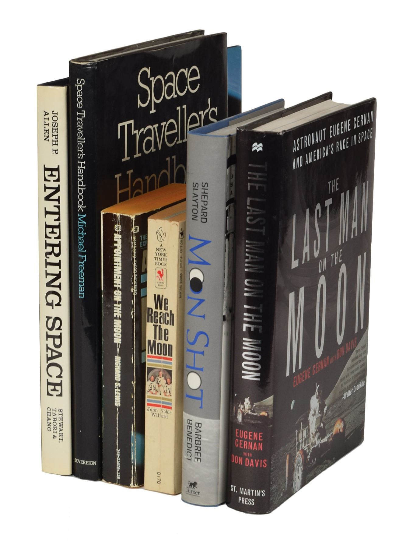 Large assortment of items from the collection of KSC Extravehicular Crew Training Engineer Dan Schaiewitz, including: two items signed by Edgar Mitchell (SP and TLS); eight original official glossy NASA photos of various Apollo mission insignias; 33 patches and decals; several official Apollo-era manuals and NASA publications, including an extensively annotated Aerospace Physiological Training Outline, a Skylab Experiments manual, NASA Facts newsletters, NASA telephone directories, and various contractors’ brochures; and an assortment of space-related books and magazines. In overall very good to fine condition.