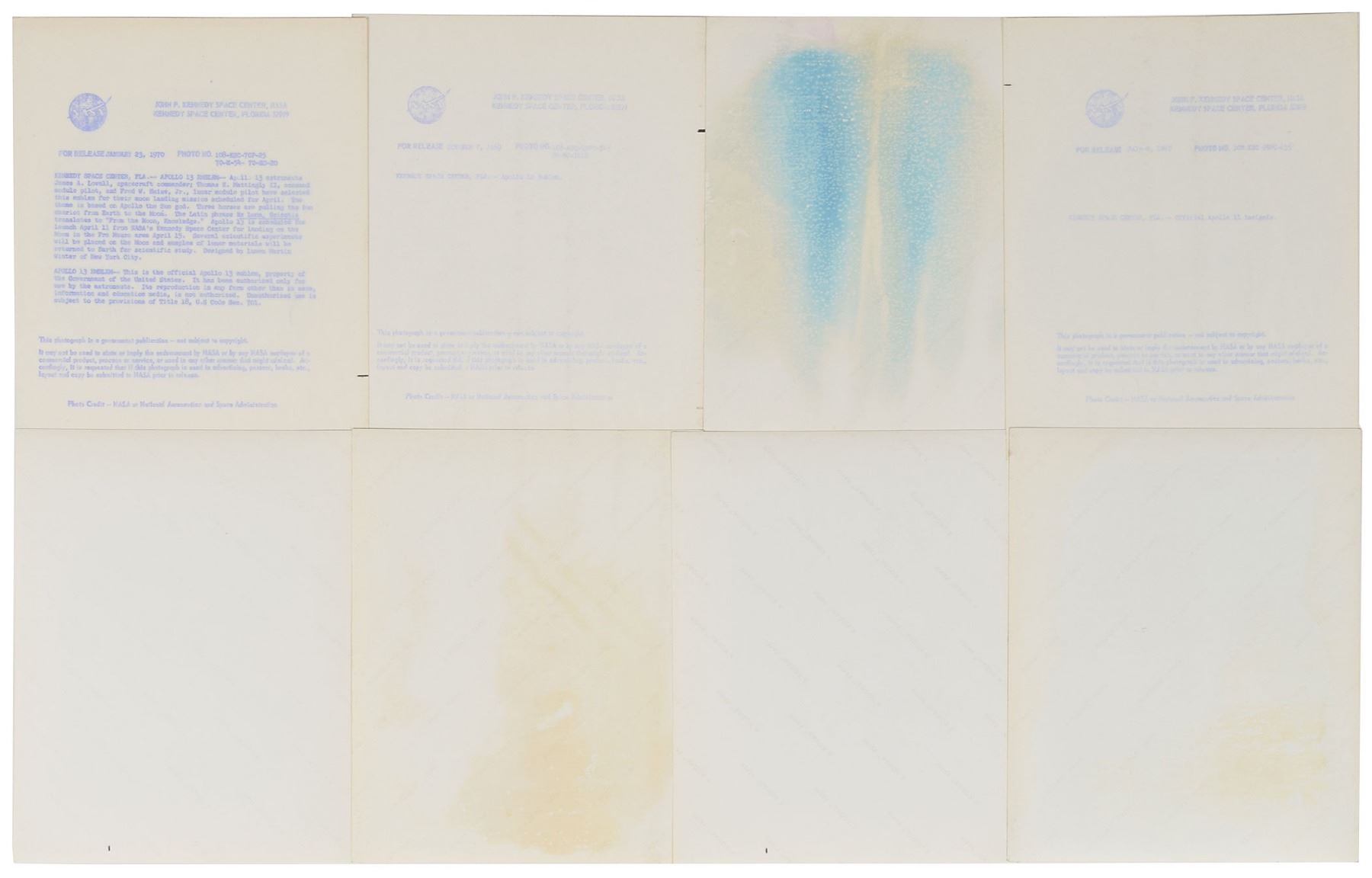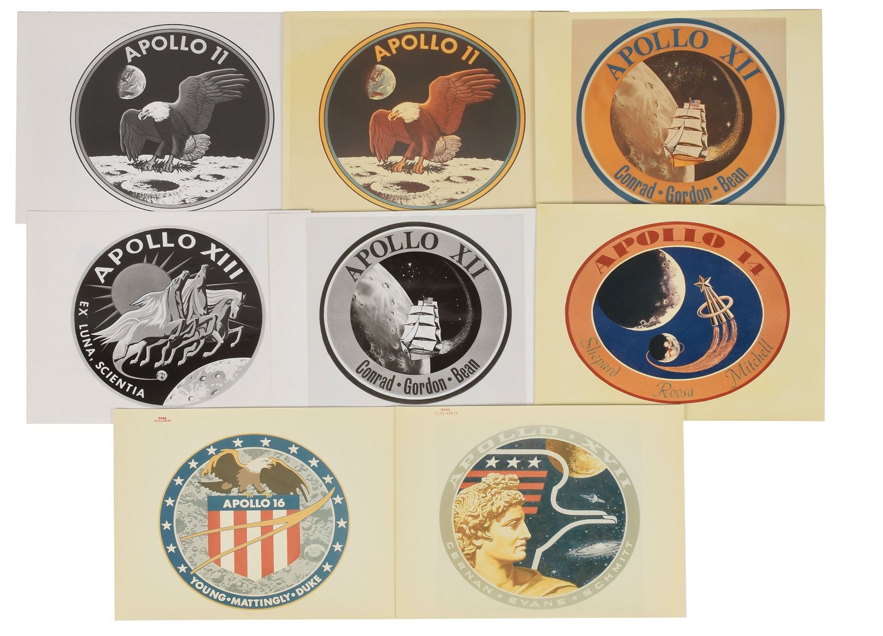 A collection of eight original official vintage glossy 10 x 8 photos of the various Apollo mission insignias, including: black-and-white and color photos for Apollo 11; black-and-white and color photos for Apollo 12; a black-and-white photo for Apollo 13; a color photo for Apollo 14; a red-numbered color photo for Apollo 16; and a red-numbered color photo for Apollo 17. The black-and-white photos have purple NASA caption text on the reverse, and the color photos have "A Kodak Paper" watermarks on the reverse.