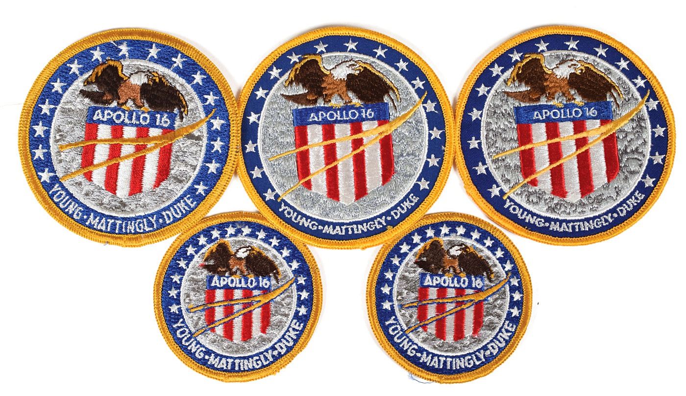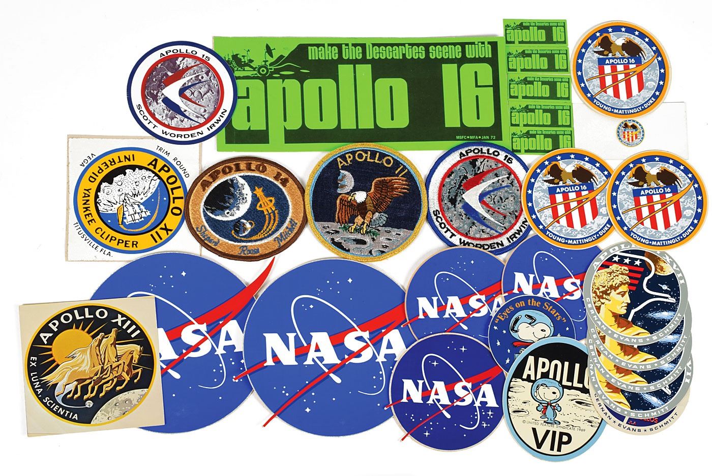 A collection of 33 patches and decals, including: three mission insignia patches for Apollo 11, Apollo 14, and Apollo 15; seven general decals, including Snoopy "Eyes on the Stars," Snoopy "Apollo VIP," and five NASA 'meatball' logos of various sizes; mission insignia decals for Apollo 12, 13, and 15; five Apollo 16 mission insignia patches; ten Apollo 16 decals, consisting of insignias and "Make the Descartes scene with Apollo 16" stickers; four Apollo 17 insignia decals; and an Apollo 17 "Well Done" decal.