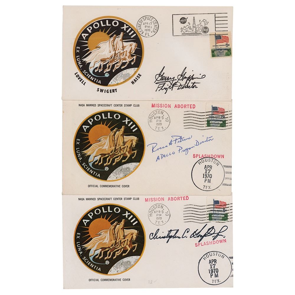 Three commemorative covers with color cachets honoring the Apollo 13 mission, all postmarked on April 17, 1970, the date of mission ‰Û÷splashdown,‰Ûª individually signed in ballpoint or felt tip by a noted NASA director: ‰ÛÏChristpher C. Kraft, Jr.,‰Û ‰ÛÏGerry Griffin, Flight Director,‰Û and ‰ÛÏRocco A. Petrone, Apollo Program Director.‰Û Two covers are stamped ‰ÛÏMission Aborted, Splashdown.‰Û In overall very fine condition.