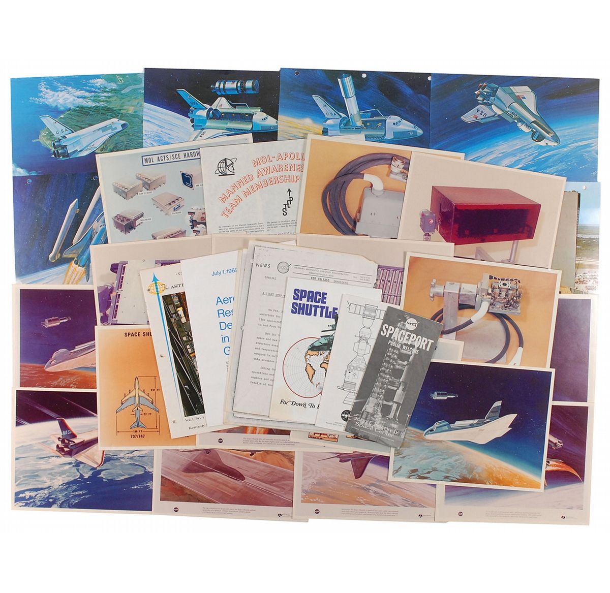 Collection of approximately 30 items from the personal collection of an engineer who worked on NASA’s Manned Orbiting Laboratory project, consisting of a ‘MOL-Apollo Team Membership Certificate’ signed by astronaut Karol J. Bobko, and numerous official photos and prints of various parts and spacecraft designs, some on heavy glossy stock and others on paperstock, as well as various booklets and pamphlets. In overall fine condition.
