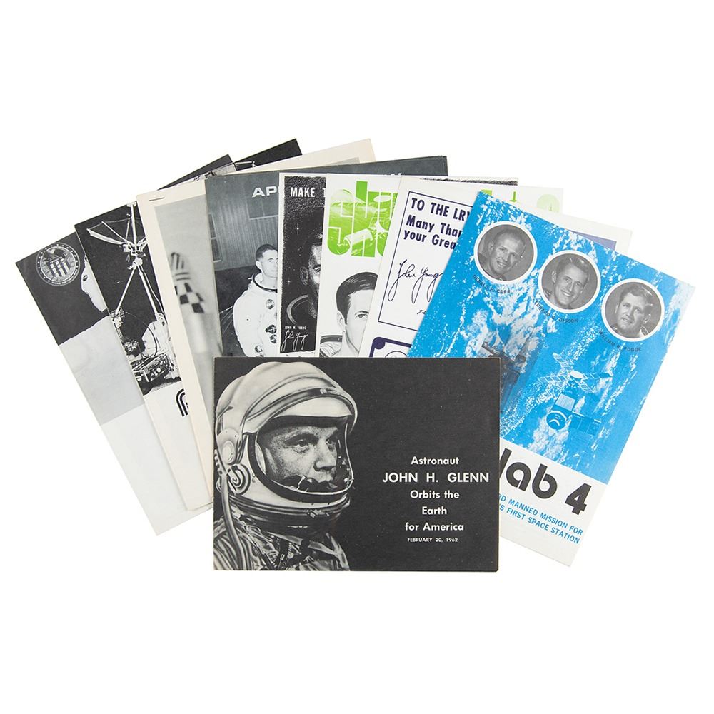 Interesting lot of NASA ephemera, consisting of various brochures, newsletters, handbills, and mini posters. Includes: NASA Manned Flight Awareness newsletters for Apollo 15, Apollo 16, and Skylab 4; three mini posters for Apollo 16 (2) and Skylab 1 & 2; five North American Rockwell handbills depicting the Apollo 8 crew and discussing the successful mission; a booklet covering John Glenn's Mercury-Atlas 6 orbital mission; and a packet of paperstock images covering Glenn's success on the Friendship 7. In overall fine condition.