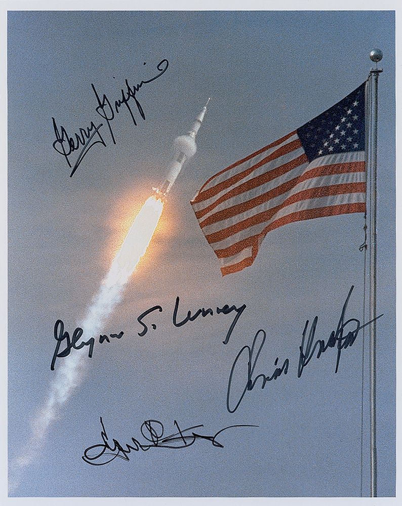 Two color satin-finish 8 x 10 photos, one of the launch of Apollo 11, the other an image of Neil Armstrong’s footprint on the moon, each signed in black felt tip by Gene Kranz, Chris Kraft, Glynn Lunney, and Gerry Griffin. In fine condition.