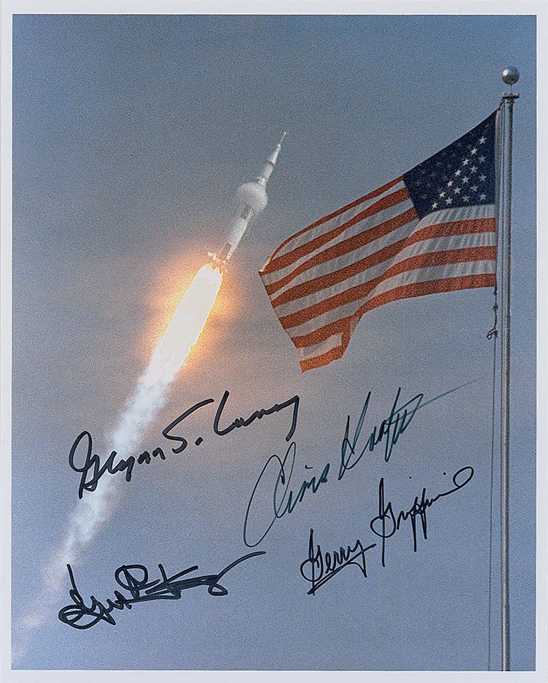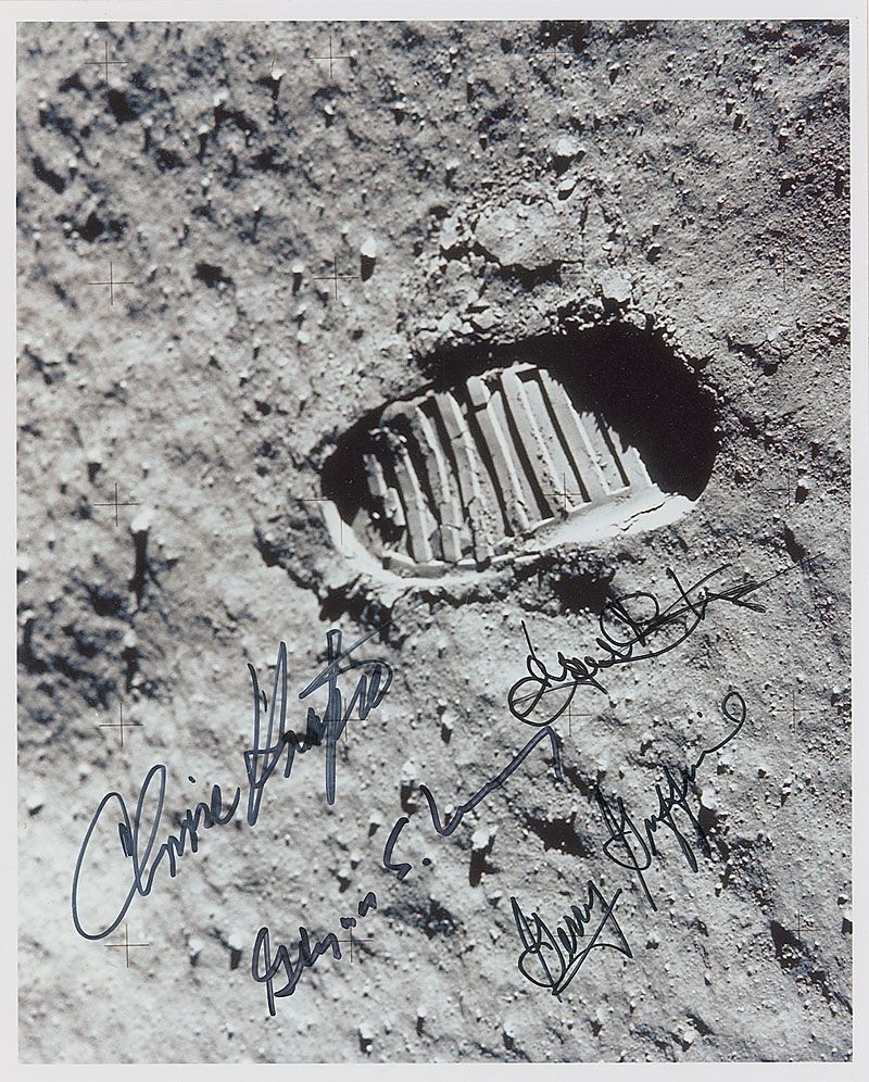 Two color satin-finish 8 x 10 photos, one of the launch of Apollo 11, the other an image of Neil Armstrong’s footprint on the moon, each signed in black felt tip by Gene Kranz, Chris Kraft, Glynn Lunney, and Gerry Griffin. In fine condition.