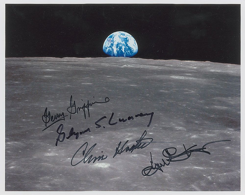 Color satin-finish 10 x 8 photo of the lunar surface, with the earth rising in the background, signed in black felt tip by Gene Kranz, Chris Kraft, Glynn Lunney, and Gerry Griffin. In very fine condition.