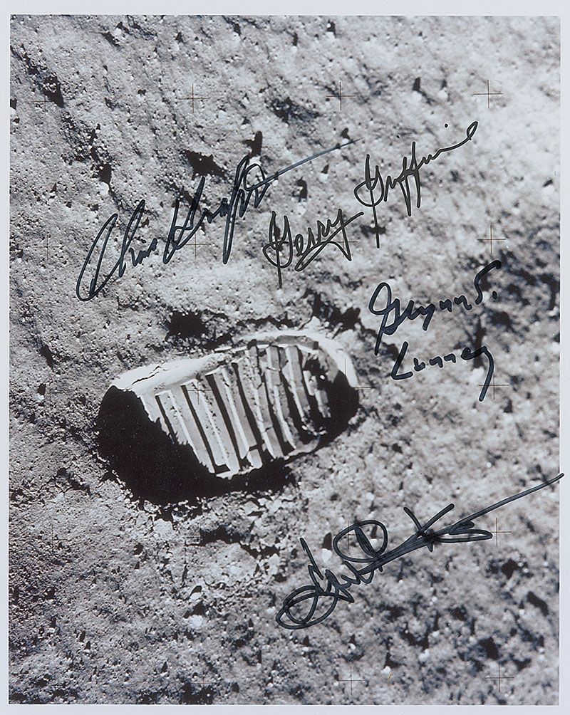 Color satin-finish 8 x 10 photo of a footprint on the lunar surface, signed in black felt tip by Gene Kranz, Chris Kraft, Glynn Lunney, and Gerry Griffin. In very fine condition.