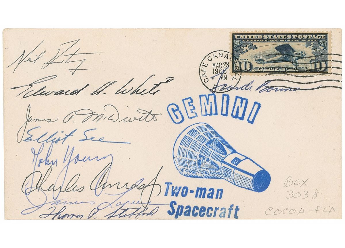 Commemorative cover with a cachet honoring the Gemini two-man spacecraft, signed in blue and black ballpoint by all nine astronauts: Neil Armstrong, Edward H. White II, Elliot See, James Lovell, James McDivitt, Charles Conrad, Thomas Stafford, John Young, and Frank Borman. Pencil notation to lower right corner and cancellation marks and stamp affecting Borman’s signature, otherwise fine condition. All but See would fly in the Gemini program. He was slated to be the commander of Gemini 9, but died in a plane crash before the mission. The importance of the Gemini project cannot be overstated as it bridged the gap between the Mercury and Apollo programs, enabling two of these Gemini astronauts to walk on the moon.