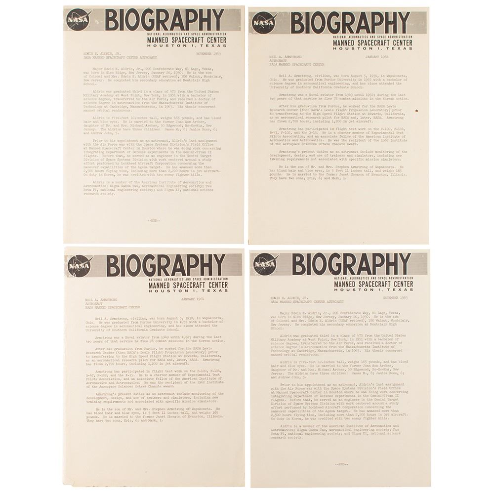 Four vintage NASA "Biography" packets from the Manned Spacecraft Center, each 8 x 10.5, with two dated November 1963 and two dated January 1964. The 1963 packets contain biographical summaries for the Mercury Seven and the men of NASA Astronaut Group 2, and the 1964 packets contain summaries for NASA Astronaut Group 3. In overall fine condition, with one of the 1963 covers detached but present.