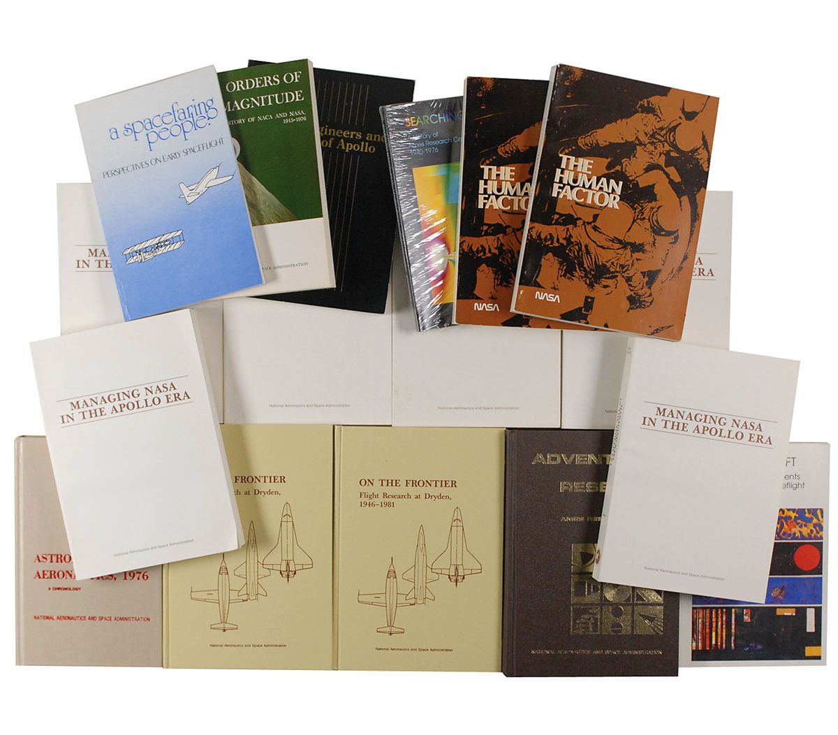 Collection of 17 hardcover and softcover books from the NASA History Series. Titles are: Adventures in Research; On the Frontier: Flight Research at Dryden 1946–1981 (2); Managing NASA in the Apollo Era (6); The Human Factor (2); Living Aloft; NASA Engineers and the Age of Apollo; A Spacefaring People: Perspectives on Early Spaceflight; Searching the Horizon; and Astronautics and Aeronautics, 1976. In fine condition.