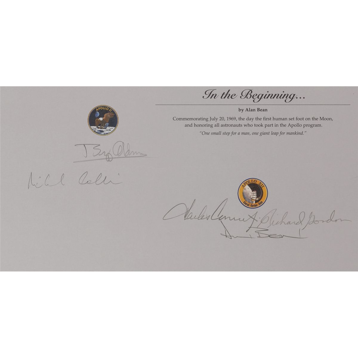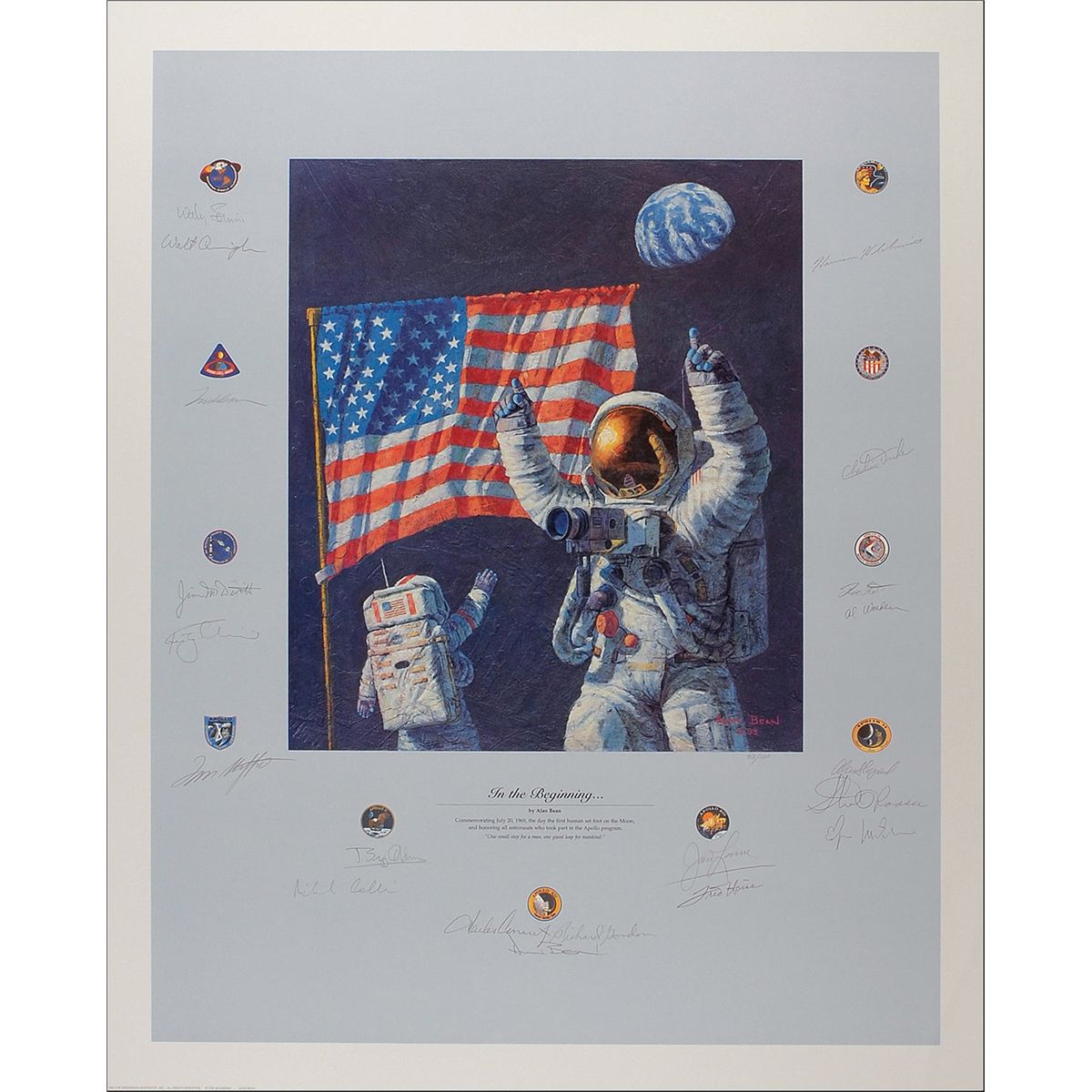 Beautiful, difficult to find, color limited edition 22.5 x 28.5 lithograph entitled ‘In the Beginning,’ originally done by Alan Bean, numbered #918/1000, signed in pencil by 20 Apollo astronauts, each signing under their respective mission emblem. Signers are: Wally Schirra, Walt Cunningham, Frank Borman, Jim McDivitt, Rusty Schweickart, Tom Stafford, Buzz Aldrin, Michael Collins, Charles Conrad, Richard Gordon, Alan Bean, Fred Haise, James Lovell, Harrison H. Schmitt, Charlie Duke, Dave Scott, Al Worden, Alan Shepard, Stu Roosa, and Edgar Mitchell. Litho is housed in its original presentation folder and comes with its original shipping box. In very fine, never before displayed, condition. A visually-stunning collection of Apollo astronauts.
