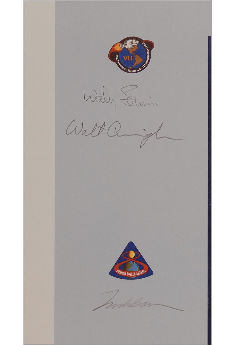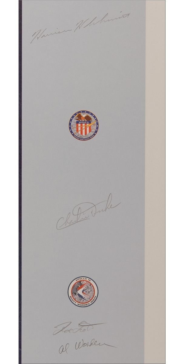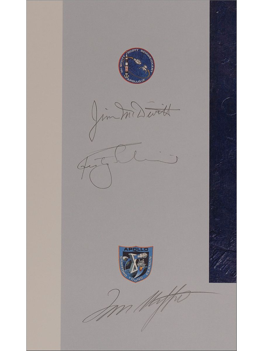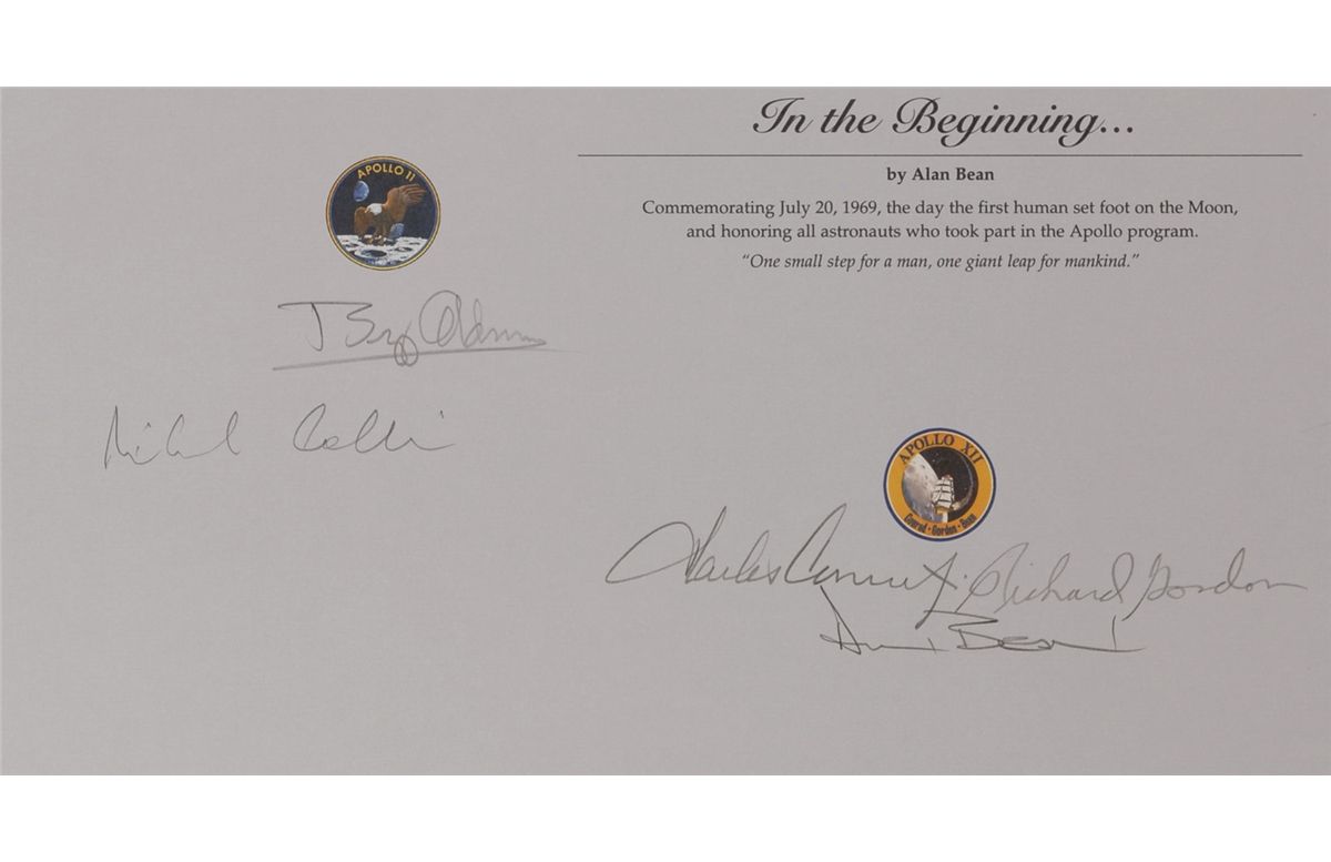 Beautiful, difficult to find, color limited edition 22.5 x 28.5 lithograph entitled ‘In the Beginning,’ originally done by Alan Bean, numbered #918/1000, signed in pencil by 20 Apollo astronauts, each signing under their respective mission emblem. Signers are: Wally Schirra, Walt Cunningham, Frank Borman, Jim McDivitt, Rusty Schweickart, Tom Stafford, Buzz Aldrin, Michael Collins, Charles Conrad, Richard Gordon, Alan Bean, Fred Haise, James Lovell, Harrison H. Schmitt, Charlie Duke, Dave Scott, Al Worden, Alan Shepard, Stu Roosa, and Edgar Mitchell. Litho is housed in its original presentation folder and comes with its original shipping box. In very fine, never before displayed, condition. A visually-stunning collection of Apollo astronauts.