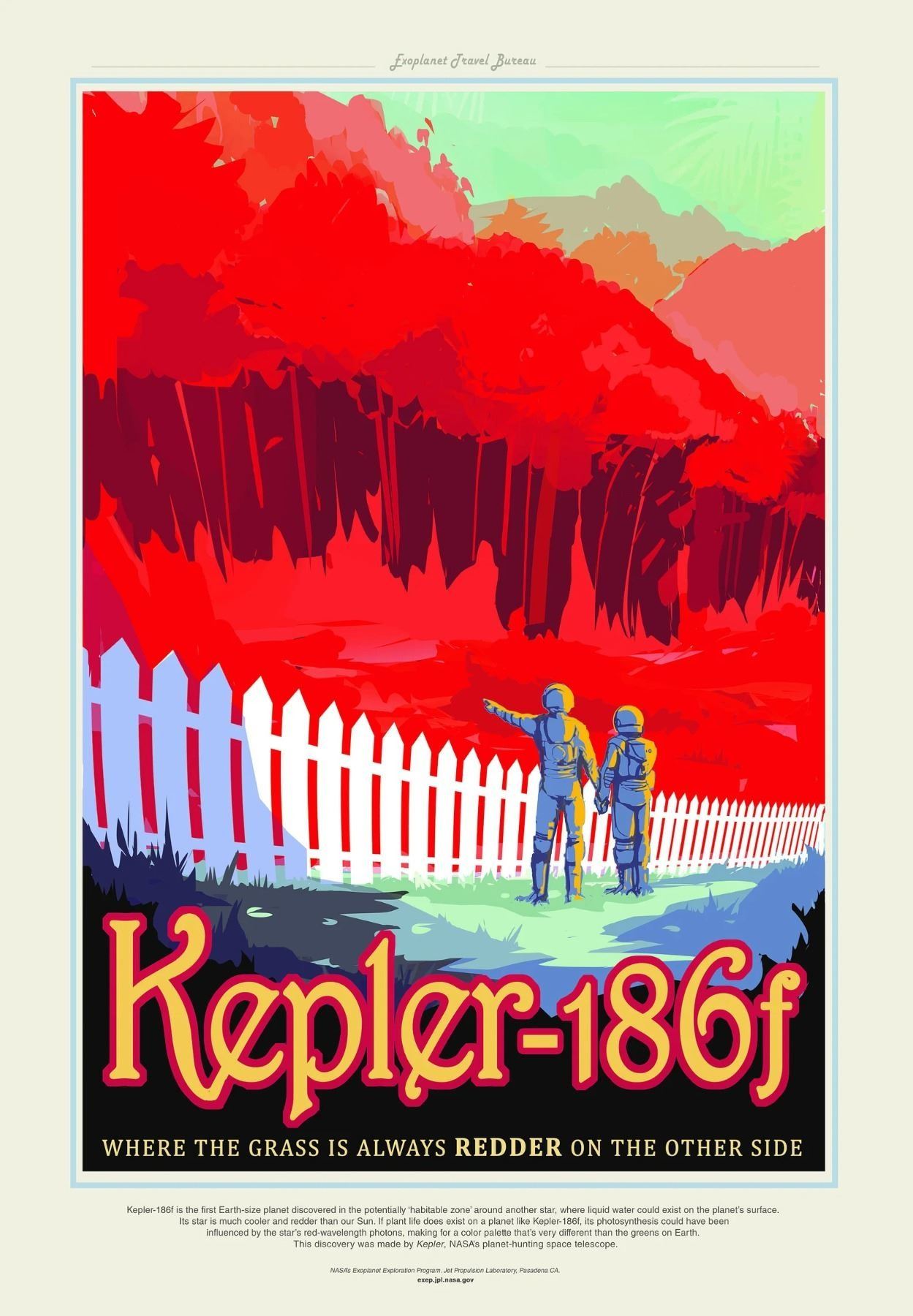 The Kepler 186f Space Travel Poster designed by JPL / NASA. The concept here was about how plants might be very different colors on planets around other stars, since the star's spectrum of light would be different. The poster is a play on an old saying, with "the grass is always redder on the other side of the fence." There's whimsy in the design, making people wonder why there would be this white picket fence on an alien planet. Kepler-186f is an exoplanet orbiting the red dwarf Kepler-186, about 550 light-years from the Earth. It is the first planet with a radius similar to Earth's to be discovered in the habitable zone of another star.