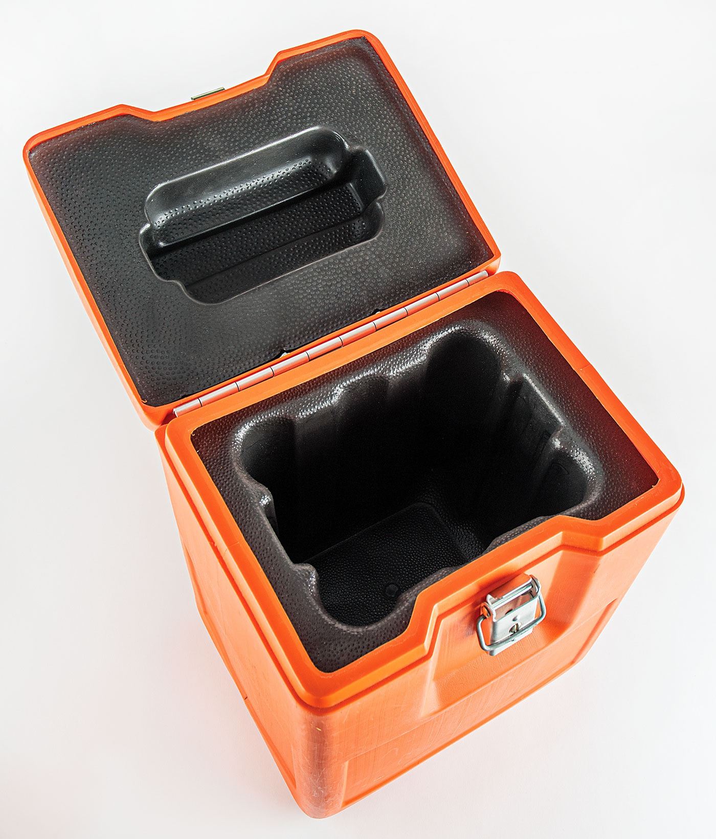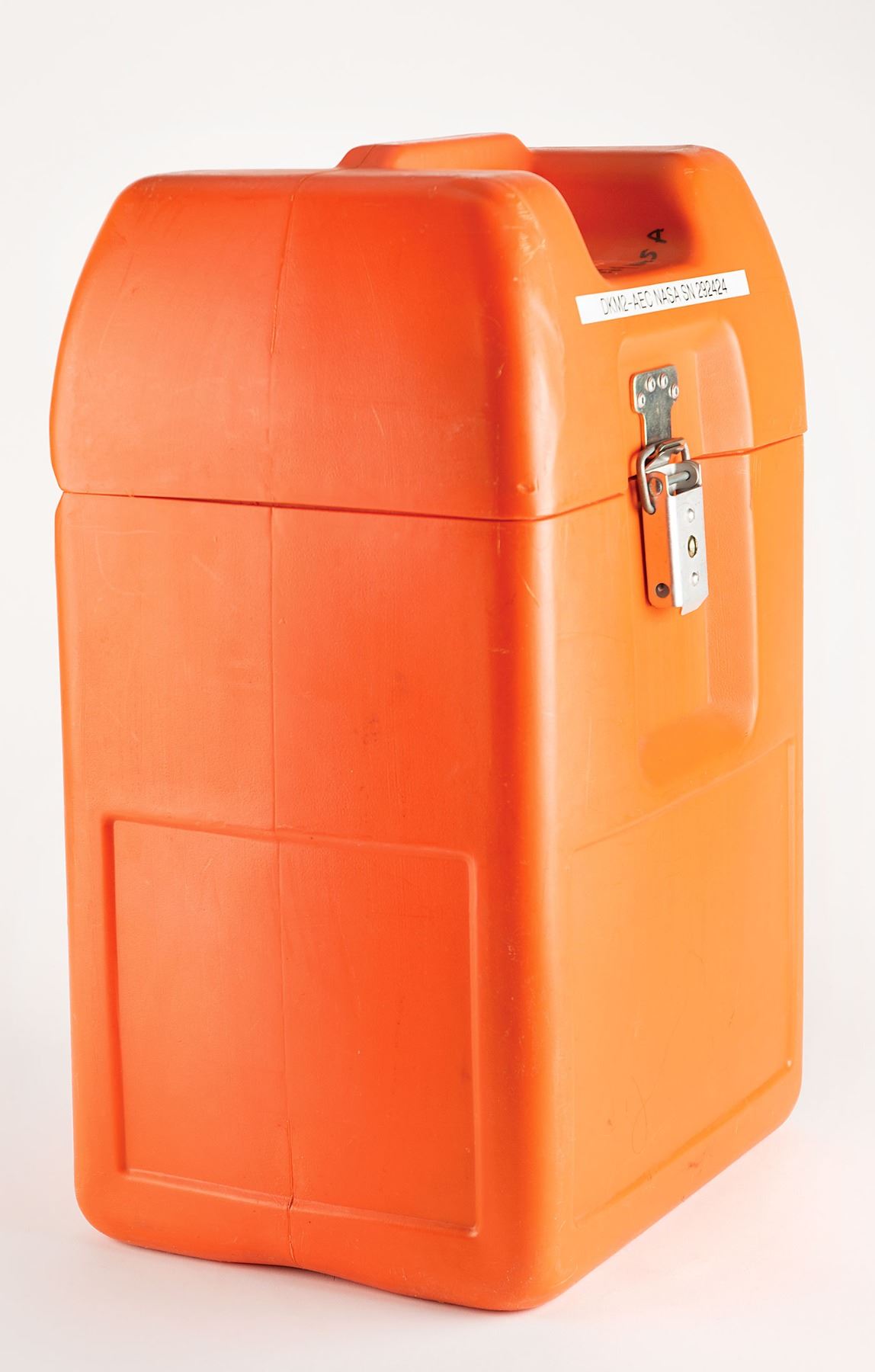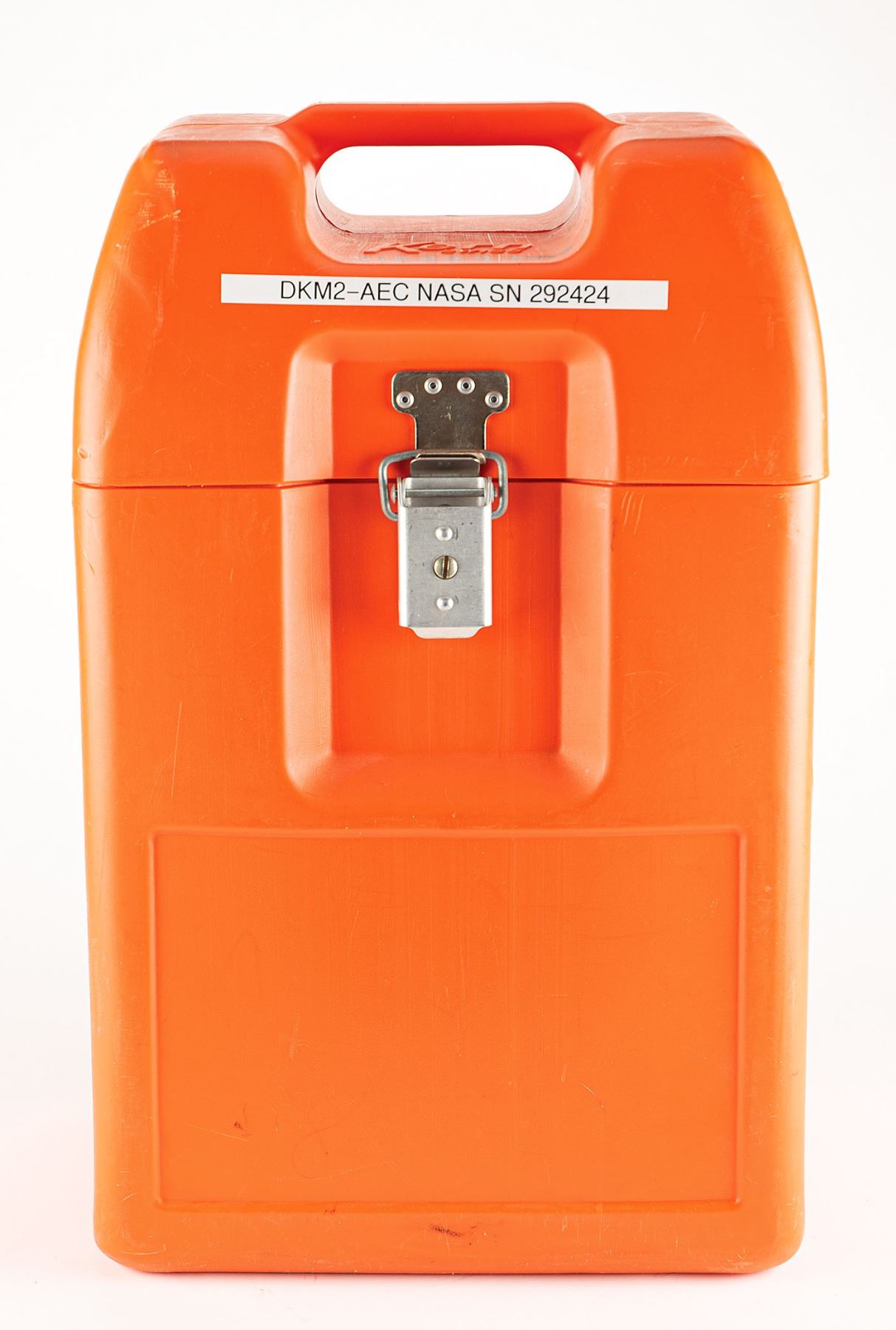 Robust and high-precision Swiss-made Kern DKM2-AE theodolite surveying instrument with NASA property tags on the side, serial no. 292424, complete with its matching metal case and its thickly-padded bright orange Kern travel case. In very fine condition. Though not a flight item, this would have been used by NASA for ground surveying of things like camera positions. This is a 1-second instrument and cost about $10,000 in 1970.