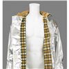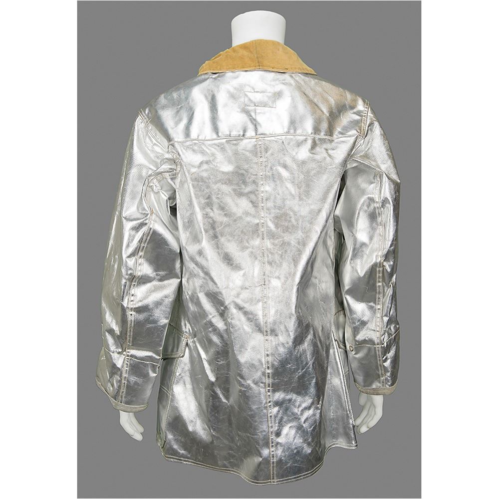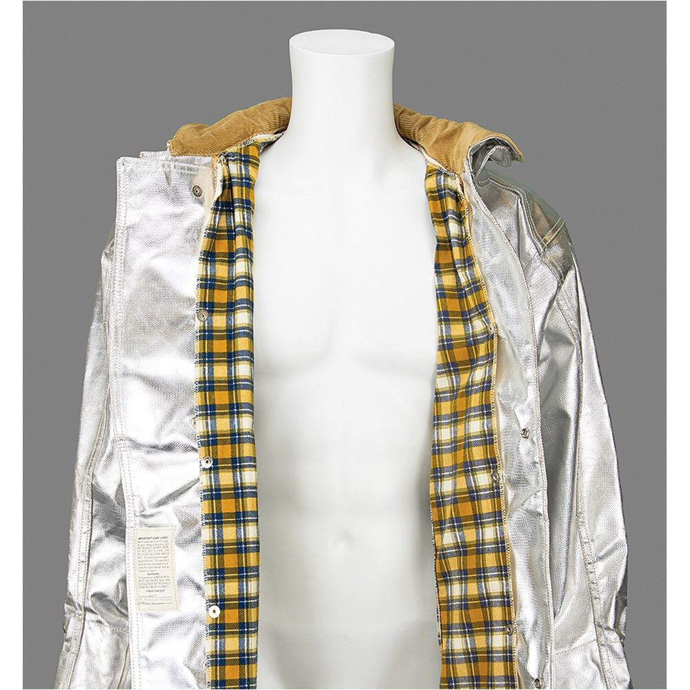 Shimmering silver thermal protective fire jacket from the NASA Langley Research Center, tagged as "Fyrepel Model 0-35/C, Size 42-44, Slvs. 34è," with clasp closures down the placket and a flannel lining. Includes a Scott pressure demand regulator mask and tank bracket backpack with pressure reducer assembly, LifeGard IV alarm pack (marked "Property of NASA Fire Dept"), and air supply gauge.