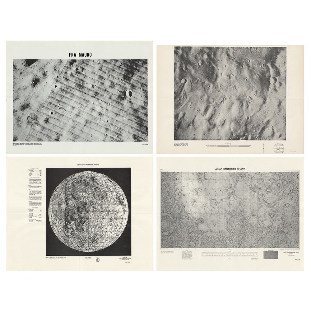Four official printings of lunar maps: one entitled "LEM-1A, Lunar Earthside Hemisphere, 3rd Edition, July 1967," 22 x 17, published by the Aeronautical Chart and Information Center from a mosaic compiled in November 1962; one entitled "Lunar Earthside Chart (LEC-1), Scale 1:5,000,000, 1st Edition July 1968, Provisional," 22 x 17, created using Lunar Astronautical Chart (LAC) map data and images from Lunar Orbiters III and IV; one 1:10,000 scale image of the Fra Mauro region of the moon, 22 x 17, prepared under the direction of the Department of Defense; and one untitled and undated 1:8,000 scale image of a section of the lunar surface, 22 x 16.25, published under the direction of the U.S. Army Topographic Command. Folded and in overall fine condition.