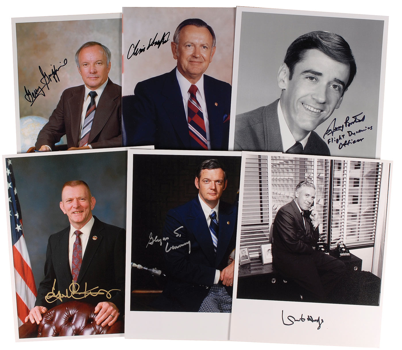 Six signed 8 x 10 photos, color and satin-finish, including four color, each signed in ink or felt tip by the Mission Control members. Signers are: Chris Kraft, Gene Kranz, John Hodge, Gerry Griffin, Glynn Lunney, and Jerry Bostick. In very fine condition.