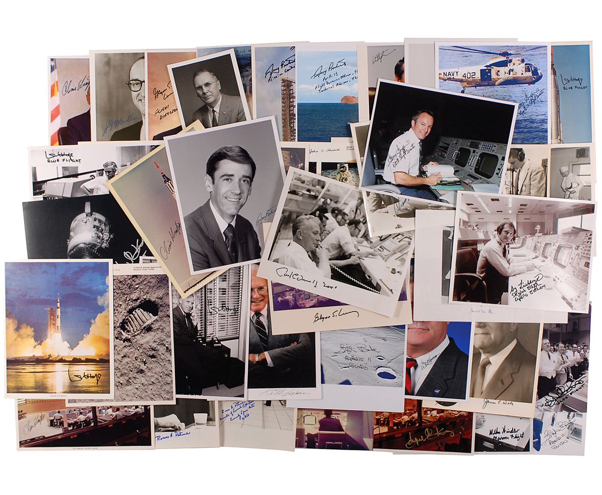 Forty-two signed photos, various finishes, almost all 8 x 10 or 10 x 8, each signed by a member of NASA’s mission control. Signers include: Arthur Stephenson, Hugh Dryden, Gene Kranz, Joe Schmitt (2), Glynn Lunney (2), Roscoe Petrone, Sy Liebergot, Jerry Bostick (3), Gerry Griffin (3), Chris Kraft, and one signed by Kranz, Kraft, and Lunney. In overall fine condition.