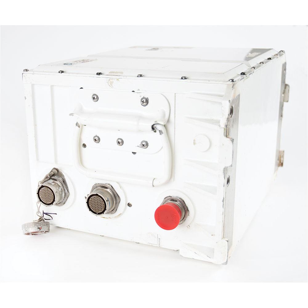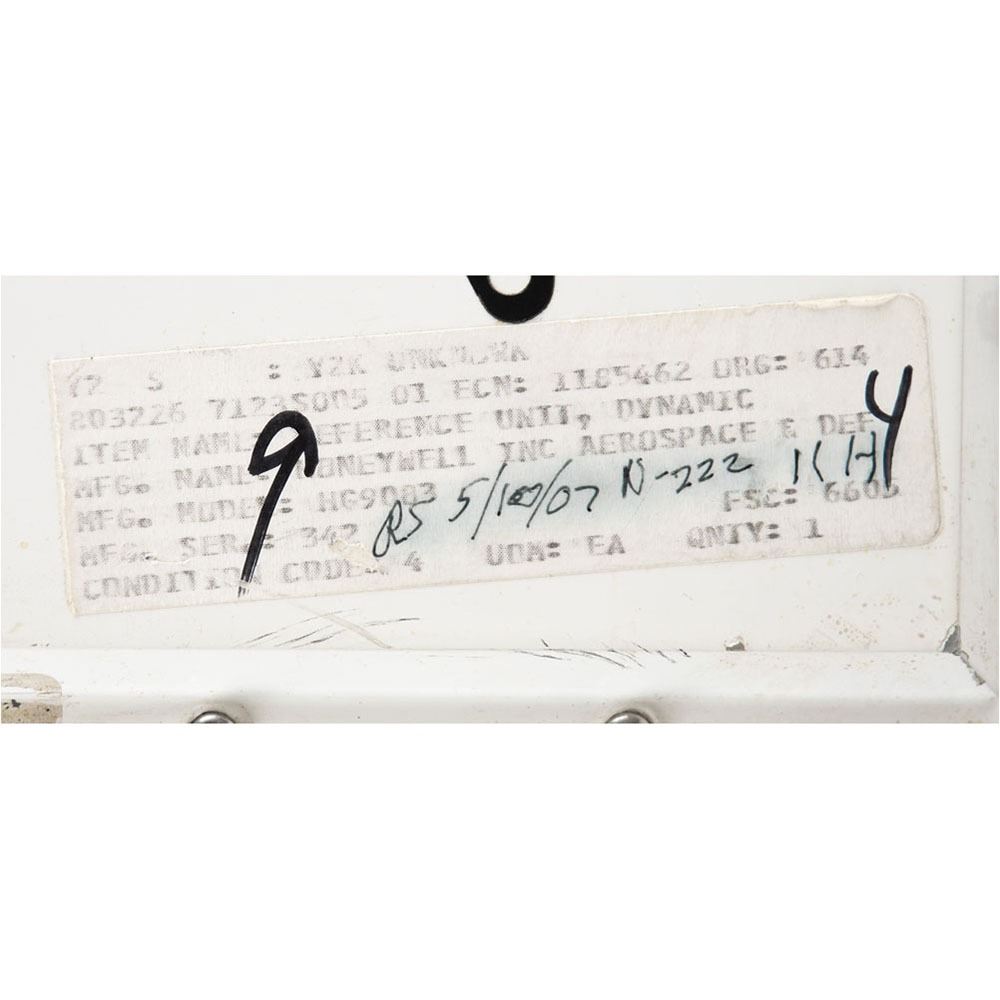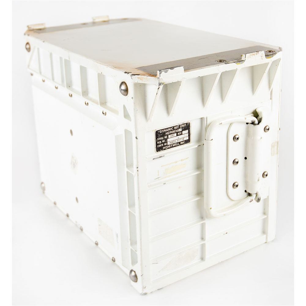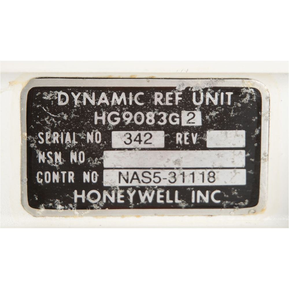 Ring laser gyroscope system for a satellite associated with the NASA Goddard Space Weather Research Center, measuring 15è x 10.75è x 9è, with a Honeywell label on the side: "Dynamic Ref Unit, HG9083G2, Serial No. 342, Contr No. NAS5-31118." The system contains three ring laser gyroscopes and the electronics to operate the gyros and process the signals that came from them.