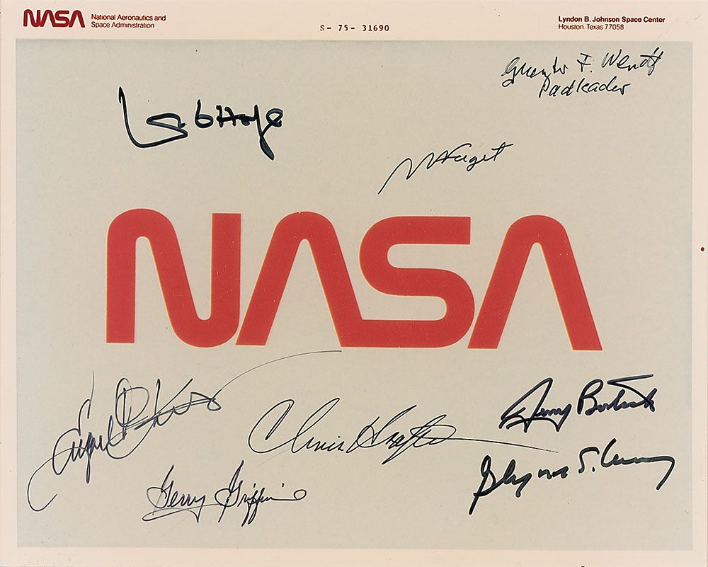 Color satin-finish 10 x 8 ‘red-numbered’ NASA photo of the NASA logo, signed in black felt tip by Max Faget, John Hodge, Guenter Wendt, Chris Kraft, Glynn Lunney, Jerry Bostick, Gerry Griffin, and Gene Kranz. In fine condition.