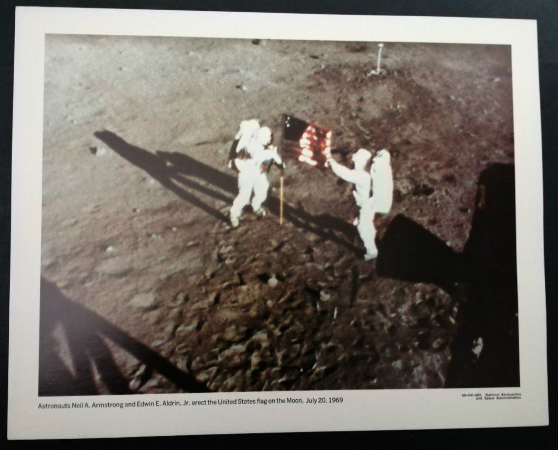 July 20, 1969, Neil Armstrong and Buzz Aldrin errect the US flag on The Moon. 14x11 inches.