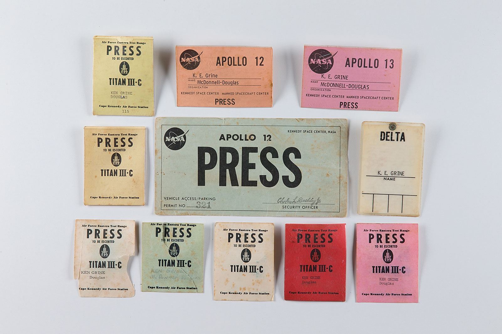 Group of 11 official KSC/NASA press badges and passes issued to Ken Grine, for programs including: Delta; Titan III-C (7); Apollo 12 (2); and Apollo 13. Four of the Titan III-C passes are no longer in their plastic badge holders. In overall very good condition, with wear, bends, and staining from use, and edge chips and tears to a few of them.