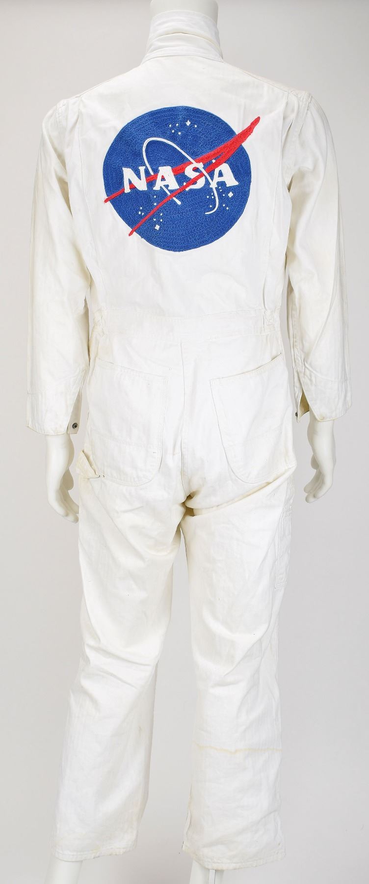 Uncommon white Apollo-era NASA coveralls worn by a personnel member at the Manned Spacecraft Center during the late 1960s and early 1970s, no size (likely large), with pockets to chest and rear and the back featuring a large embroidered NASA 'meatball' logo. In fine condition, with scattered light stains. From the personal collection of Paul Kruppenbacher, a member of the NASA Houston Landing and Recovery Division who trained Apollo astronauts in water recovery procedures and was deployed on U.S. Navy aircraft carriers for crew and spacecraft recovery operations.